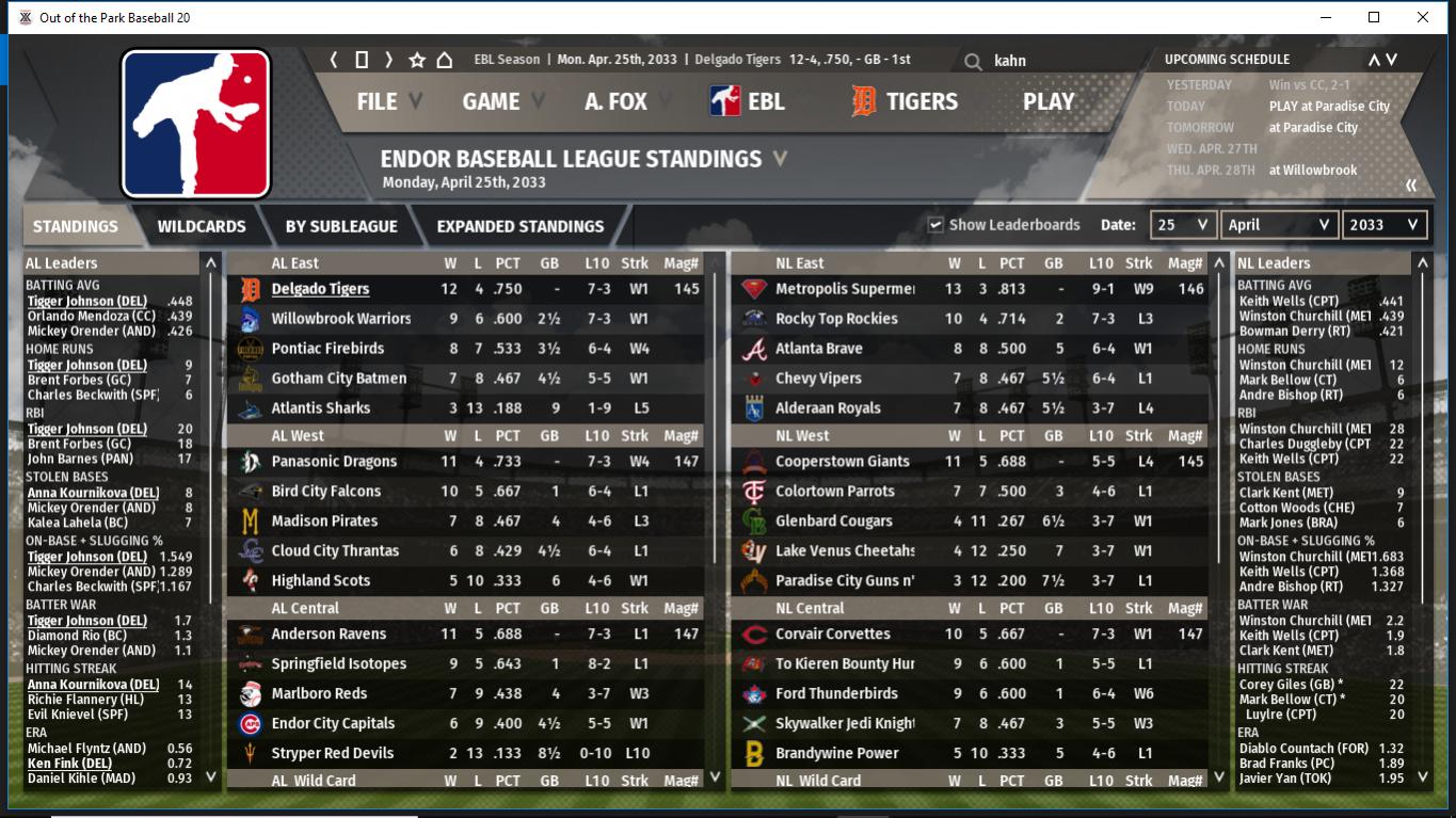 Panasonic leads the AL West by 1 game. Anderson continues to surprise people in the Central. Metropolis has taken over in the NL East. Cooperstown has slowed a bit but still leads the NL West by 3 games. Corvair leads the Central by 1 game over the Bounty Hunters & T-birds.
