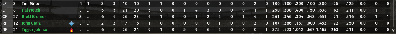 Coming back to Willowbrook i dont know if i will be cheered for leaving or booed for leaving. With the fact that the team was way over budget they were unable to keep 1b John Niec and then they traded Cf Bamm-Bamm Rubble along with moving a few pitchers. I would have found a way to keep them. Still have a solid team though. Toro as lead and at SS gives them a lead off hitter who gets on base and can run a bit. Black gives them a ton of power. Duncan is still great. Frog, thankfully is suspended for 4 games, so we will not see him this series.