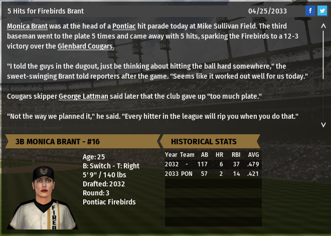 Pontiac 3b Monica Brant has a 5 Hit game. Lake Venus will miss RP Manny Acosta for 4 months. Oakland will miss SP Manuel Dias for 4-5 weeks. Marlboro SP Lamar Buckley pitched a 2 Hit CG SH.