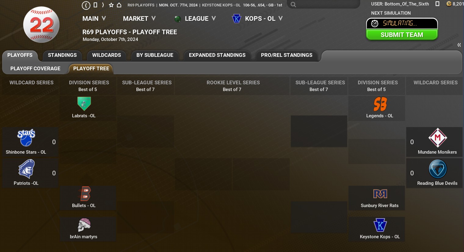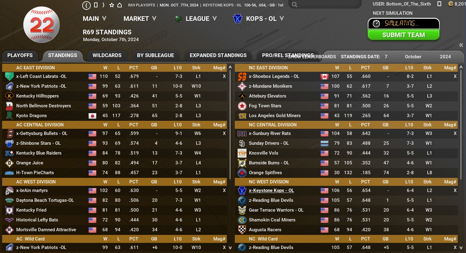 as Nowhere claimed the division crown with 118 wins. (three seasons, win totals of 103, 96, and 109... and only 1 division crown to show for it. Tough crowd.)On the mound, Cy Young was virtually untouchable this season, posting an impressive 26-3 record, with a 1.69 ERA and 239 strikeouts (and would claim the award for most pitching wins and best ERA). Not to be outdone by his teammate, Don Sutton posted a solid 22-4 record of his own, with a 2.60 ERA and 246 strikeouts. The team overall had a solid offensive year (as usual, expected with the ramped up offensive park ratings of The Spile), ranking 1st in runs scored, batting average, and OPS; and 2nd ranked in on base percentage, batting WAR, wOBA , and base running. The part of the team stats that still impresses me is the fact the pitching/defensive ratings didn't suffer due to the park dimensions. The Syrups ranked 1st in starters ERA, pitching WAR, and zone rating; 2nd ranked in runs against, bullpen ERA, FIP, and defensive efficiency; and 3rd ranked in strikeouts and errors. Waffletown will host Port Ruppert in the wild card match. While the Syrups took the season series 5 games to 1, the regular season means nothing in the playoffs (and the pessimist in me expects nothing less than a spectacular flameout to cap off the year )