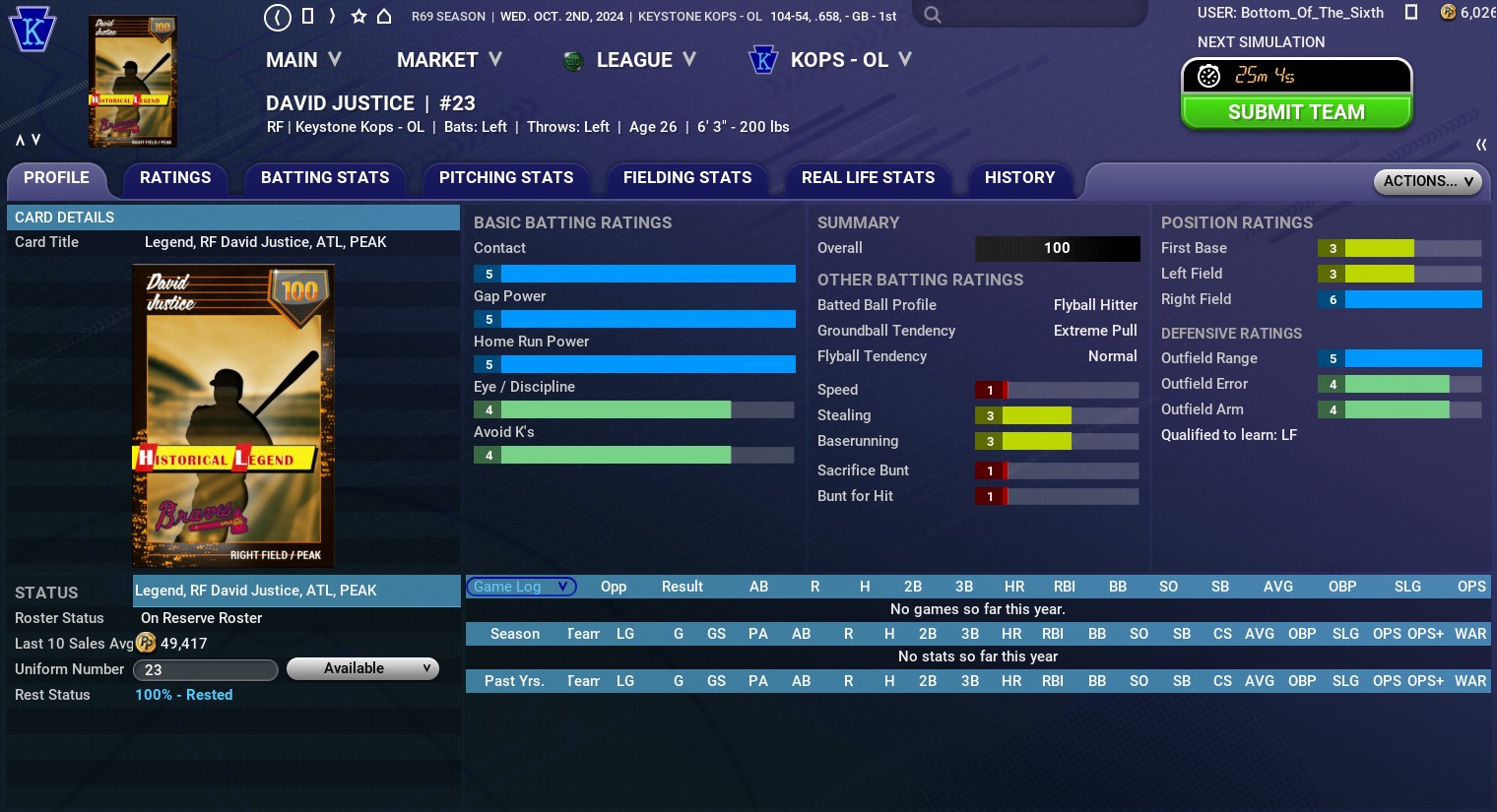 My strongest motivation in building a team is to get players I enjoyed back in the day, or old timers from the storied past. That is why I didn't go after the special editions in earnest. Too many of them are players I have had recently, and wanted a change from, or are recent enough to be from the time I stopped following baseball. I'm not that worried where my team finally levels off because of OL. We have such a nicely diverse mix of approaches that it will result in having at least a few teams to compete against for the only prize that matters (to me at least) - an OL crown. A question - do the rest of you get attached to players and, at some point, find it hard to move on from them? Last edited by Stanley Kuppchaser; 04-24-2021 at 10:45 PM. |