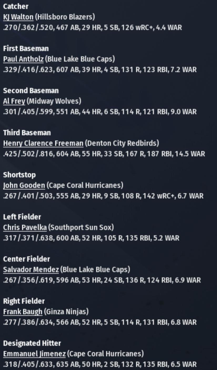 John Thompson led Glasco to a splendid 107-55 record, its first division title, and the franchise's first Islandian Pro Alliance championship. Jesse Collier led Ginza to the top regular season mark in the IPA at 110-52.