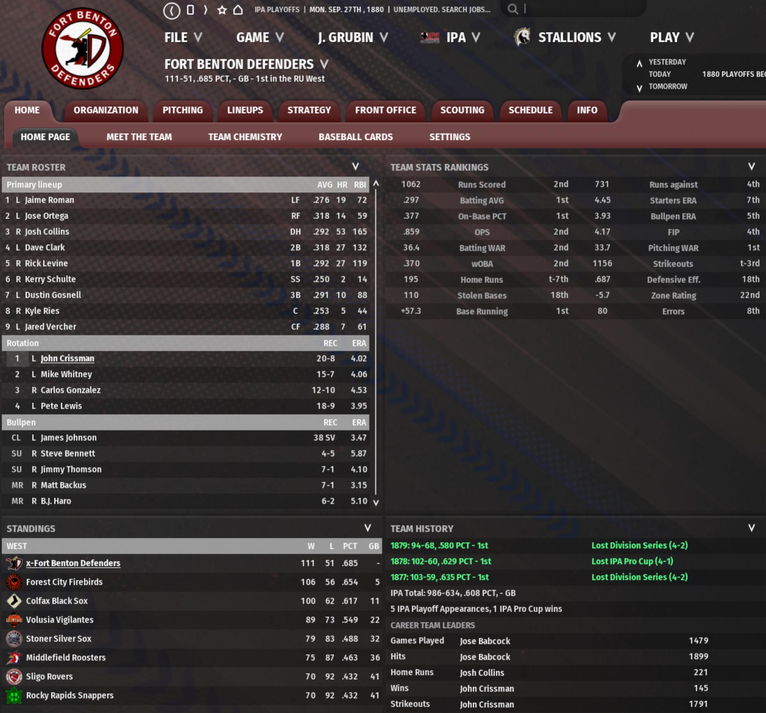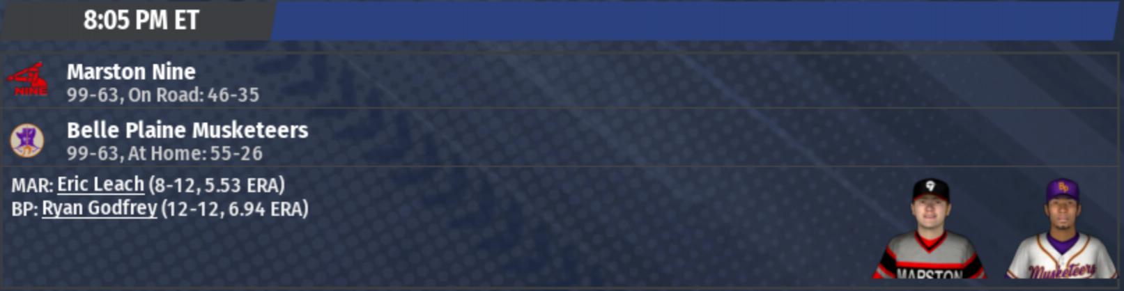 It's now the year 1880, the 10th season of my IPA. There will be one divisional tiebreaker on which to report: The RU East. Belle Plaine and Marston have finished tied at the top of the standings. Marston is looking for their 2nd straight division title - the Nine reached the Ruthlandian Union Championship Series last season. The Belle Plaine Musketeers had won 6 straight division titles until Marston broke their streak last year; the Musketeers hope to rise to the top again for the 7th time in 8 years. Belle Plaine, in spite of their regular season success, has never reached the Pro Cup.