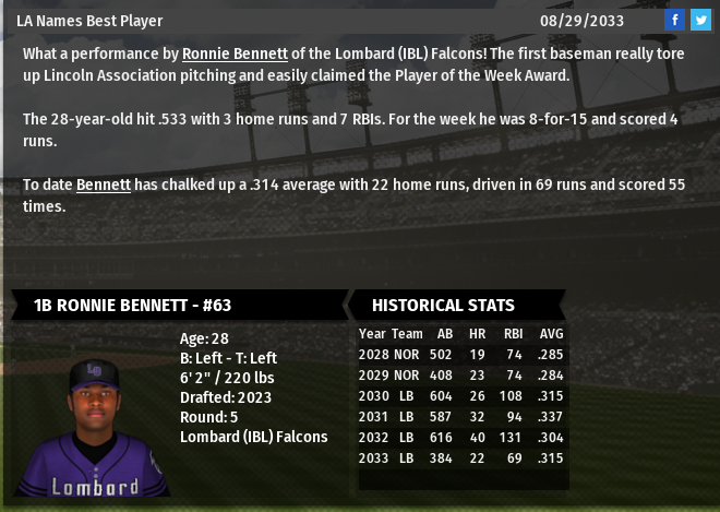 Willowbrook SP Benji Self is named AL POTM. Metropolis SP Jimmy Olsen is named NL POTM. Delgado 1b Mighty Joe Young is named AL ROTM. Metropolis LF Logan is named NL ROTM.
