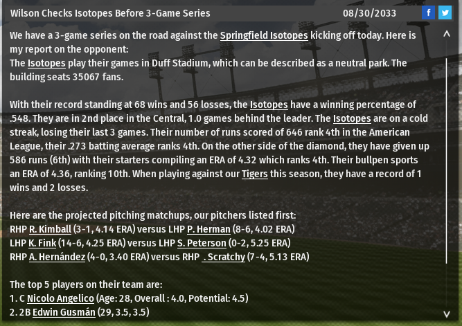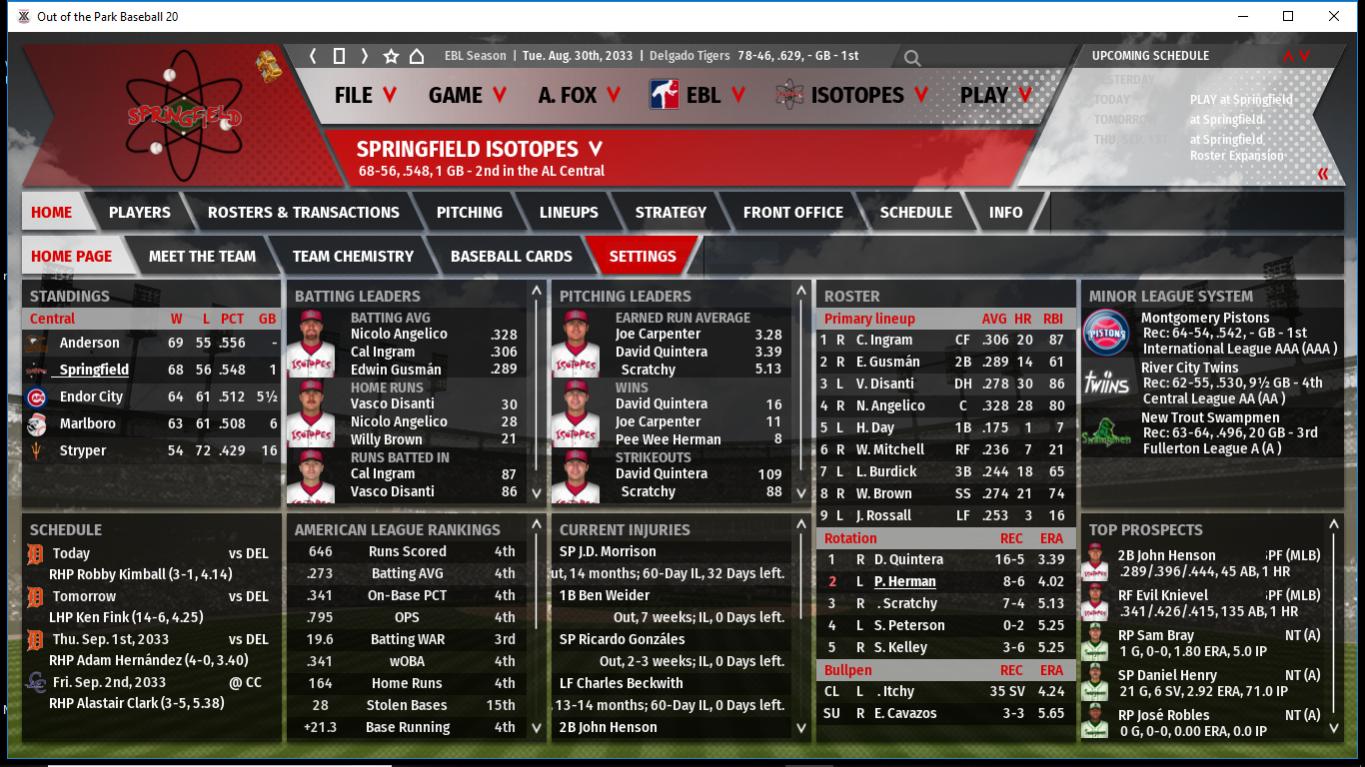 We are 2-1 vs the Isotopes this season. Springfield is still a fairly young team and they are competing for the AL Central crown. They have several good players injured. Offensively they are solid with DH Disanti, C Angelico, SS Brown & Cf Ingram. Their rotation is among the AL best with veteran Quintera, rookie Herman and veteran Scratchy with Peterson & Kelley. Their pen has workhorse LHP Louis Fuller and his 109 IP with no starts, CL Itchy and SU Ken Capelli. 2b Kool Kat was sent down to AAA to help them with the playoffs and I called up IF Charles Neeley. He may not play much but can still play all 4 IF spots and has some speed.