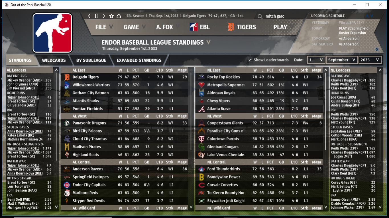 Rockies lead Supermen by 1.5 games in the NL East. Dragons lead Falcons by 4.5 games in the AL West. Brandywine leads Ford by 1/2 game in the NL Central. Ravens lead Isotopes by 2.5 games in the AL Central. Supermen have an 8 game lead for the NL WC. Warriors lead Isotopes by 5.5 games for the AL WC.