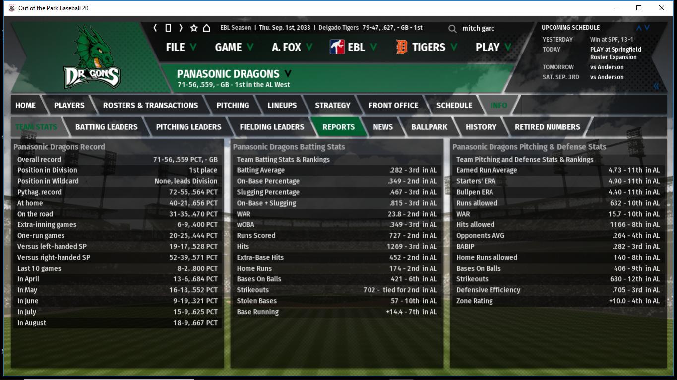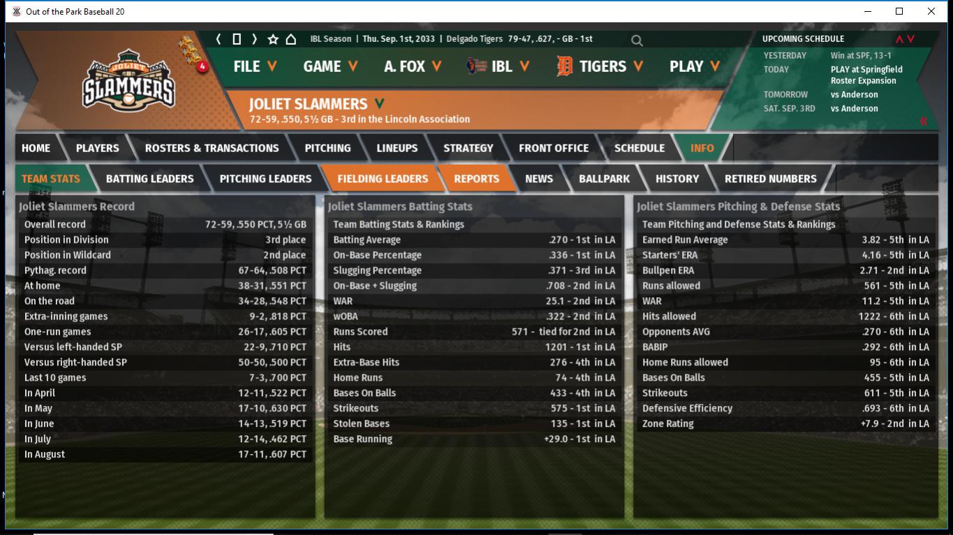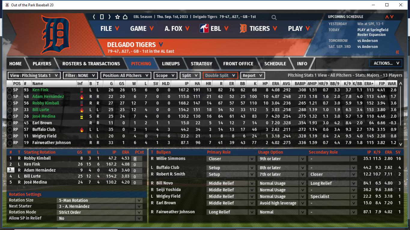 We didn't lose a single series in August. At times we were unstobbable. I can't complain about much. We also now have a winning record on the road. For September, we only play 8 games on the road. The month starts out tough with 2 AL Central contenders in Springfield & Anderson, then we see the 2032 BOE champ Guns N' Roses. 4 @ Batmen then 3 at home vs the Warriors. If we maintain our 7 game lead going into that series we can put them in the rearview once and for all. 4 vs Sharks. 3 @ Stryper. 3 vs potential AL West winners in Bird City. 3 vs Parrots, get to see Perch & Rush. We end the month vs Gotham City. Hopefully 18-10 worse case. Our only issue right now is our bullpen, stat wise. We are a finesse rotation, which is fine when our IF defense is going great.