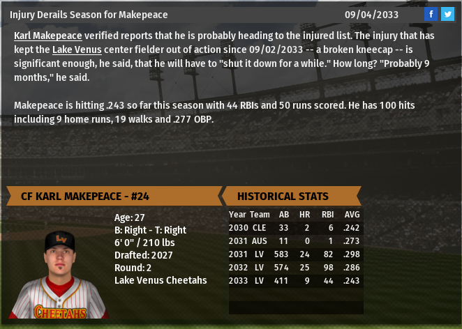 Lake Venus loses Cf Karl Makepeace for 9 months. Kansas City Royals traded RP Gareth Whitlow & SP Francisco Contreras to the Corvair Corvettes for a minor league 1b.