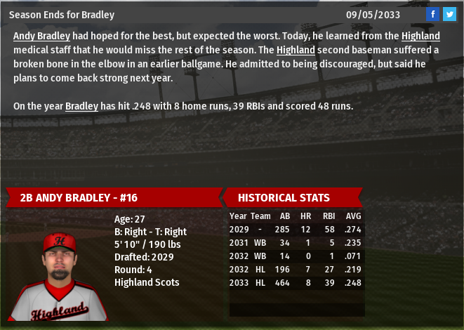 Todd Scott is back and Charles Neeley is staying. Our roster is at 27 for now. Todd starts vs RHP and platoons with Joe & Jason vs LHP. Neeley will play from time to time as the DH. After Bespin's season is over here are just some of the players i will call up: C Rebecca Hoffman 1b Ming Li Cf Gerald Russell SS Rum Tum Tugger 2b Kool Kat SP Bill Stupec SP Neil Diamond CL Rooster Evans I have 5 open spots on the 40, so there will be a few more. Player Spotlight 2b Charles Neeley R/R #13 Charles 1st came up with Ford while Admiral Fox was managing them. He is married to Samantha Neeley and has played with her in Ford and in the Delgado minor leagues. Admiral Fox wants both to take over as MGR & HC in the Delgado minor league system eventually. He is arbitration eligible but will not be offered ARB making him a FA. RP Earl Brown R/R #45 Earl was projected to be a solid SU man with the Tigers this season but was part of the early season bullpen issues. He has CL potential and hopefully this is just a hiccup in a solid career. His future for next season with the Tigers is up to him.