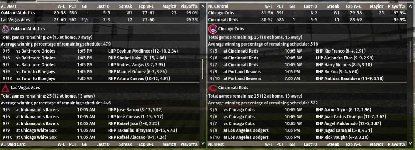 Nationals lead Mets by 3 games in the NL East. A's lead Aces by 2.5 games in the AL West, Cubs lead Reds by 1 game in the NL Central. Aces lead Buckeyes by 4.5 games for the 2nd AL WC. Reds lead Beavers by 5.5 games for the 2nd NL WC.