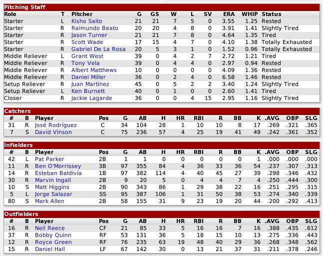 It seems like we are playing all the winning teams in our league at this point. And this is so. The Thunder had the best record in the Continental League, surviving a so-so pitching staff with a healthy dose of brute offense that had already scored them 649 runs, which meant they scored a hair over five runs a game. I won’t bother you with the Raccoons’ output. After Neil Reece got rest in the last game against the Condors, we gave rest to Mr. Monsterbash, Royce Green, in the opener here. De La Rosa pitched in the rotation slot of the injured Raimundo Beato, facing Hachim Kiara (5-2, 3.15 ERA). But for all the Thunder’s offense, the Coons scored first in the bottom 2nd, when one of Mark Allen’s rare hits went over the fence – as usual. He collected Daniel Hall, who had walked – should those two play more often? In any case, the Coons upped to 4-0 with three doubles by Salazar, Kinnear, and Reece in the bottom 5th. De La Rosa had allowed only one hit so far, but had struggled with control and was at 82 pitches through five frames, meaning I could expect yet more strain on the bullpen here. De La Rosa was accordingly done after six due to too many balls, and we threw Burnett into the game. The Thunder fielded six lefties and I hoped he would give me two innings. Burnett did as ordered, but up 5-0 we entered the top 9th facing nothing but left-handers. West was unavailable, so I went to Vela, who allowed a leadoff single to veteran Dave Browne. Next was Vonne Calzado, who sent a vicious grounder up the middle. Right here, Salazar made a play that potentionally saved the game, cutting off that seemingly sure single, stepping on second just in front of the incoming Browne, and zinging it to Ingall, who had replaced Baldy on first base. Double play. Vela finished the game: 5-0 Raccoons. Salazar 2-5; Kinnear 2-4, 2B, RBI; O’Morrissey 2-4; Vinson 2-4, RBI; De La Rosa 6.0 IP, 1 H, 0 R, 3 BB, 3 K, W (5-2) and 1-2, 2B; We 4-hit the most potent offense in the league. That’s enough to pop open some of that prickly stuff that night. Also: Neil Reece has a 12-game hitting streak going. Game 2 was about managing your team. I failed. In the bottom 1st, Higgins was sent stealing, but was thrown out, before Royce Green hit a homer on the next pitch. So, 1-0 lead instead of 2-0. And we had Turner pitching, which meant you just waited for that inning where the opposition would turn your guy inside out. Well, before that ever happened, the Coons skinned Oklahoma’s Lou Corbett, adding three runs in the third inning, before Higgins homered for another pair of runs in the bottom 4th. That ended Corbett’s night, and the bullpen was the really awful half of the Thunder staff. Reliever Terry Harris allowed a double to Baldivía, bringing up Royce Green, who already was on 6 TB on the day. Make it ten! Another 2-piece shot the score to 8-0, and Reece, Quinn, and O-Mo added three more hits for another run scored by Reece, 9-0. And it wouldn’t stop. Higgins logged his fourth hit of the day, a 1-out single in the fifth, after which Baldy hit an RBI triple. If that guy triples on you, you’ve got a true problem. And THEN the Thunder turned Turner inside out and quickly slapped him for three runs. Late in the game, Baldy would even get a shot on the cycle, having registered all hits but a homer in his first three plate appearances. He singled the fourth time up, and came up with two out in the bottom 8th, but grounded out. No history books today. But we still had to pitch some here. Up 11-3 after seven, we brought in Daniel Miller to pitch himself back into our hearts and get rid of that ugly 7.20 ERA. Miller finished the job, but it wasn’t pretty, getting ahead of only one of the seven batters he faced and was helped greatly by a double play behind him. Still, he finished the game. 12-3 Raccoons! Higgins 5-5, BB, HR, 3 RBI; Baldivía 4-6, 3B, 2B, RBI; Green 3-5, 2 HR, 2B, 5 RBI; Quinn 2-4, BB, RBI; O’Morrissey 2-3, BB, 2 RBI; Miller 2.0 IP, 1 H, 0 R, 1 BB, 1 K; That’s some offense! Higgins was on base six times for 8 TB, Baldy had 7 TB, Green 10 TB. Can’t you always play this way? :-P Game 3. If we can complete the sweep, we’re suddenly at .500 again. Scott Wade had to get the job done, facing Makoto Kogawa. Those two had identical ERA’s of 3.54, and also with .500 records (7-7 for Wade, 11-11 for Kogawa). Both were righties. Both allowed two hits and a run through four innings. Similarities ended in the fifth, in the bottom of which Salazar got on with no outs, but was forced out on a Vinson grounder. Still, Vinson was safe at first, bringing up Allen, who landed a hit. And you know that Allen’s hits usually travel half a mile: the Coons took a 3-1 lead. While Wade was stellar through six, he did run the game almost aground in the seventh, walking a pair and then dropping the grounder that had THIRD OUT written all over it to allow one runner to score. The Coons got that run back on reliever Tony Simpson in the bottom of that inning, making it a 4-2 game, while Wade was pinch-hit for and was done for the day. But we got great relief from Matthews, West, and Lagarde, where only our ancient southpaw allowed one runner en route to close out the game. 4-2 Coons! Salazar 2-2, BB, 2B; Allen 2-3, HR, 2B, 3 RBI; Wade 7.0 IP, 3 H, 2 R, 1 ER, 2 BB, 2 K, W (8-7); Well, THAT sweep came certainly out of nowhere! We were “only” 16-12 in August, not overwhelming per se, but certainly when compared to our season before that, but we have won nine of our last ten! September Callups Entering September – and I am not in earnest believing we can still take the division – we have a rotation comprised of true ace Kisho Saito, a former sparkling diamond constantly being roughed up (Jason Turner), a 2-pitch guy continuing to astonish (Scott Wade), a decent starter at AAA (Gerardo Ramirez), and a guy who had started AND relieved at two different levels this year (Gabby De La Rosa). It’s patchy. The