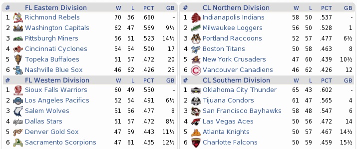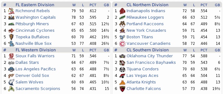 The Capitals are in their fifth consecutive postseason and have never lost in the FLCS in that stretch. The Capitals had by far the best pitching staff in the Federal League, while the offense was a bit slower than in previous years. From that offense they will also be without outfielder Dale Cleveland in this series. Star outfielder Jeffery Brown hit for .889 OPS this year, but hit only 12 home runs. The Warriors came about out of nowhere with a tough-as-nails rotation headed by veteran Ricardo Torres (18-12, 3.23 ERA) and hotshot Aaron Anderson (16-15, 3.86 ERA). They won their division, however, with the second-worst slugging percentage and the least home runs in the league! In turn, they drew the most walks. One of their “biggest” offensive factors, 37-year old INF Manuel Flores, is out with a sprained ankle. The Loggers won the CL North by simply outlasting the struggling competition and posted their first winning season ever. While they had a good pitching staff, their offense was rather mediocre. From their good pitching staff, SP Rafael Garcia and MR Raymond Leger are out with injuries. Led by outfielder Cristo Ramirez (.888 OPS), nobody on the team hit more than 11 homers this year. The Thunder outlasted the Condors and Bayhawks despite a terrible bullpen (worst in the Continental League) thanks to a humming offense that scored 801 runs, which topped the CL. Their offense is powered by Will Jackson (.285, 26 HR, 113 RBI) and Vonne Calzado, the CL’s batting champion. Except for catcher Tashiro Ikeda and the pitcher, the Thunder can mount seven players batting .270 or more – and sometimes significantly more. Prediction time: Capitals in six, Thunder in five, but I still hope for the Loggers to pull off a minor upset here. Warriors @ Capitals … 2-0 … (Warriors lead 1-0) … SFW Aaron Anderson 8.0 IP, 4 H, 0 R, 2 BB, 5 K, W; Loggers @ Thunder … 2-4 … (Thunder lead 1-0) … OCT Jeff Martin 3-4, 2B, RBI (yeah, THAT Jeff Martin) Warriors @ Capitals … 2-0 … (Warriors lead 2-0) … SFW Ricardo Torres 8.0 IP, 7 H, 0 R, 3 BB, 3 K, W; WAS Ramon Ortíz 8.0 IP, 4 H, 2 R, 2 ER, 1 BB, 5 K, L; Loggers @ Thunder … 3-1 … (series tied 1-1) Capitals @ Warriors … 0-3 … (Warriors lead 3-0) … SFW Jon Robinson 7.2 IP, 5 H, 0 R, 0 BB, 7 K, W; Thunder @ Loggers … 4-3 … (Thunder lead 2-1) … MIL CL James Jenkins blows 3-2 lead in the ninth Capitals @ Warriors … 3-1 … (Warriors lead 3-1) … WAS Parker Montgomery 7.0 IP, 8 H, 0 R, 1 BB, 5 K, W; Thunder @ Loggers … 9-2 … (Thunder lead 3-1) … OCT Hector Ramirez 2-4, 3B, 3 RBI; Thunder score seven in the top 8th as the Loggers blow a 2-1 lead Capitals @ Warriors … 0-3 … (Warriors win 4-1) … SFW Ricardo Torres 7.0 IP, 5 H, 0 R, 2 BB, 4 K, W; Thunder @ Loggers … 3-4 … (Thunder lead 3-2) … Loggers blow a late lead for the third time, but recover to walk off on Miguel Vela’s RBI double off Tony Simpson Loggers @ Thunder … 7-2 … (series tied 3-3) … MIL Cristo Ramirez 4-5, 3 3B(!!!); MIL Augusto Garza 3-5, 2B, 3 RBI; MIL Bob Grant 3-4, BB, 2B, RBI; Cristo Ramirez set an ABL record with three triples in a single game, which nobody had ever done before! Loggers @ Thunder … 4-5 … (Thunder win 4-3) … MIL James Jenkins blows one game too much; OCT Sonny Reece 4-5, HR, 2 RBI (walkoff home run); OCT Will Jackson 3-5, HR, 2 RBI; MIL Drake Evans 3-5, 2 2B, RBI; First, let me express that I am STUNNED over the Capitals being shut out FOUR TIMES in the FLCS!!! I have never seen anything even remotely like that! (shakes head in disbelief) Well, the Loggers led all seven games at one point or another, and just kept blowing up. This was not the best club to start with, and their bullpen really let them down massively in this series. Too bad. --- 1994 WORLD SERIES The 91-71 Thunder in turn didn’t sparkle either on offense, which makes the 89-73 Warriors and their stud-studded rotation look like the heavy favorites for the World Series. The Warriors were champions in 1978, while no CL South team has EVER won the title. No matter which team walks off winners, they will rank among the least-winningest regular season ballclubs in history, “beaten” only by the 1989 Wolves, who went 88-74 over the year only to upset the Raccoons in the World Series, while two teams have before won the title after 91-71 seasons (matching the Thunder), the 1986 Blue Sox (who chewed up a 107-win Dallas team in that year’s FLCS) and the 1993 Raccoons. Warriors @ Thunder … 2-3 … (Thunder lead 1-0) … SFW CL Ross McCallum blows 2-1 lead in the ninth; OCT Manuel Garza 8.0 IP, 3 H, 2 R, 2 ER, 1 BB, 5 K; Warriors @ Thunder … 8-2 … (series tied 1-1) … SFW Ricardo Torres 8.0 IP, 9 H, 2 R, 1 ER, 2 BB, 3 K, W; SFW Dafe Heffer 3-5, BB, RBI; SFW John Hensley 3-4, BB, HR, RBI; Thunder @ Warriors … 8-9 … (Warriors lead 2-1) … tied 4-4 at mid-8, the Warriors blow five runs on the Thunder pen before almost blowing that lead right afterwards Thunder @ Warriors … 4-1 … (series tied 2-2) … OCT Jeff Martin 2-4, 2 2B, 2 RBI; OCT Will Jackson 3-5, 2B, RBI; Thunder @ Warriors … 3-1 … (Thunder lead 3-2) … BREAKING NEWS – SOMEBODY BEAT TORRES!! Warriors @ Thunder … 5-3 … (series tied 3-3) … 23-yr old OCT SP Millard Wilson is jumped on for all five runs in less than four innings For Game 7, the Warriors had Aaron Anderson (1-2, 2.17 ERA) available, while the Thunder had to hope for Makoto Kogawa (0-1, 5.57 ERA) to hold up. Actually, both held up well, allowing single runs, and received no-decisions. The game went into overtime at 1-1, when with runners on the corners and one out OCT Rob Guidry grounded into a double play in the bottom 9th. In the top 11th, Travis Lange’s sac fly put the Warriors up 2-1, but in the bottom 11th Sonny Reece hit a leadoff double off Luciano Parrilla and scored on Jose Marquez’ 2-out RBI single to extend the game to a 12th inning. In the top 12th, Oliver Rivera – who had only walked 