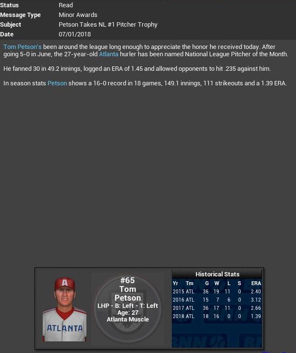 Atlanta Muscle SP Tom Petson wins the EBL NL Pitcher of the Month Award. 16-0 great season so far as Atlanta is on cruise control in the NL East.