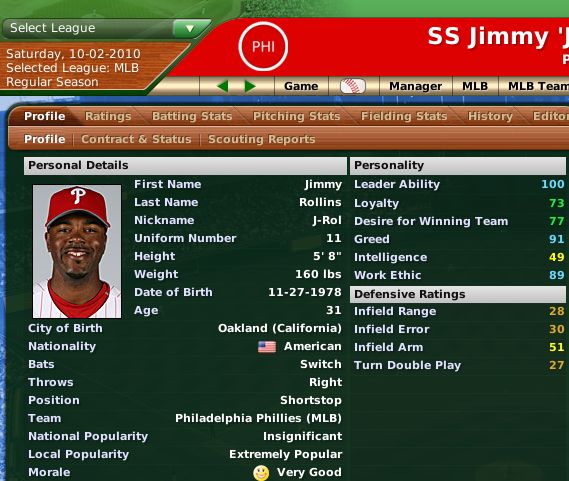 As for his speed ratings, that's something that Erich would need to speak to. When I looked up Wood's stats on the Baseball Cube, I see that he is very efficient stealing bases. He swipes them like Barry Larkin did. The speed rating might be a way to reflect his proficiency in stealing. |