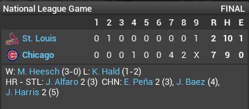 The Pirates are in last place in our division because their starting pitching has been terrible (#14 in the N.L.). The offense is not bad, led by former MVP CF Rodney Rutledge and 38-year-old 3B David Wright (signed as a free agent in the off-season). The Pirates are managed by Brad Mills (since 2018). April 23, 2021: G016 (8-8, 1 GB, 3rd) Star: STL C Jorge Alfaro 1-4, HR, 4 RBI Odorizzi 6.2 IP, 9 H, 3 ER, 0 BB, 11 K Alfaro’s grand slam was aided by the spring wind blowing out to center at 11 mph. SP John Lamb cleared waivers and was assigned to Memphis (AAA). April 24, 2021: G017 (8-9, 2 GB, 3rd) Star: STL 3B Ryder Jones 3-5, HR, 2 RBI, 2 RS CF Albert Almora also had 3 hits and a stolen base. A rain delay ended Perdomo’s day after three shutout innings. From there, a worn out bullpen got hammered as we had no choice but leave pitchers in regardless of results. April 25, 2021: G018 (9-9, 2 GB, 2nd) Star: STL SP Michael Pineda 7.2 IP, 6 H, 1 ER, 1 BB, 7 K We needed every one of those 117 pitches from Pineda with a depleted bullpen. Ryder Jones’ 2-run homer provided the winning runs. Players of the Week: AL: CLE CF Chris Snider 10-24, 3 HR, 10 RBI NL: COL RF Josh Hamilton (age 39) 11-21, 4 HR, 9 RBI We are not playing that well right now (#14 in the power rankings), but fortunately no other team in our division is either. The Cubs lead the N.L. Central at 11-7, and we go there next. Impressions of MLB compared to the CBA As a new kid on the MLB block, I have noticed a couple of differences. These MLB GMs are pretty smart. They will not take any of my excess and unwanted players, such as 1B Matt Snyder, especially in trade for their good prospects. They also assign no value to my lesser prospects. There are only a handful of players in my organization that have high trade value. This is not a complaint by the way, just an MLB-newbie observation. |