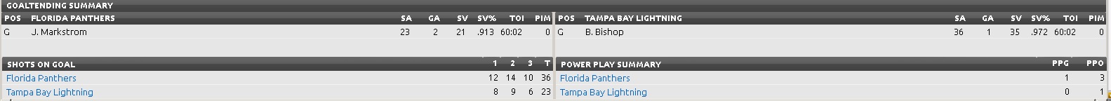 15,887 is the announced crowd at Bridgestone Arena and its loud and rocking as the opening faceoff occurs. Predators C David Legwand (7.5b/7.5b) opens the scoring from the near post on a rebound past G Tim Thomas who had no chance. Surprisingly the Panthers answer right back just 10 seconds later when RW Ales Hemsky (6.5a/6.5a) lights the lamp off the feed from Tomas Fleischmann. The first period ends with no more scoring and the Predators leading in shots 12-9. The second period is pretty even until the Pred's young D Seth Jones (7.0b/8.5b) is called for hooking at the 9:42 mark. Hemsky tallies his second goal of the night on the PP and the Panthers have a slim 2 - 1 lead. Things get testy late in the period when the Predators captain D Shea Weber (9.0b/9.5b) gets called for a major penalty for an illegal check to the head that will be surely reviewed by the league disciplinarians. The PP is productive but also gives up a SH tally before the end of the period. The Panthers have the lead 3 - 2 and have caught up in shots and now lead by a slim margin of 20 - 19 after two periods. Bonehead makes defensive changes in the 2nd intermission and all three blueline pairs will get equal ES ice time, over Coach Tyulin's obvious displeasure. This turns out to be a good move as the third period plays a much more physical style from the Predators. The first fight breaks out in front of the Panthers net after Pred's C Legwand takes an extra whack at a covered up puck and Colby Robak showed him why that's not a good thing to do. Less than three minutes later Nashville LW Richard Clune (6.0b/6.5b) offers to drop the gloves with Panthers D Eric Gudbranson (7.0a/7.5a) while the coaching staff is screaming for Gudbranson to skate away, Gudbranson ignores them and engages Clune for the second fight of the period. Bonehead is seething and now only has four D for the next two minutes and five D-men for the next five. Fortunately for the Panthers C Shawn Matthias (6.5a/6.5a) finds the back of the net just after the penalties expire and provides the breathing room as the game ends 64 seconds later. Boneheads post game conference is riddled with questions about the recent acquisition scoring his first two goals in a Panthers uniform. He praises Hemsky but makes sure everyone is aware hockey is a team game and everybody pitched in to make this victory possible. Bonehead heaps praise on the 4th checking line for completely shutting down the Predators 1st line tonight. |