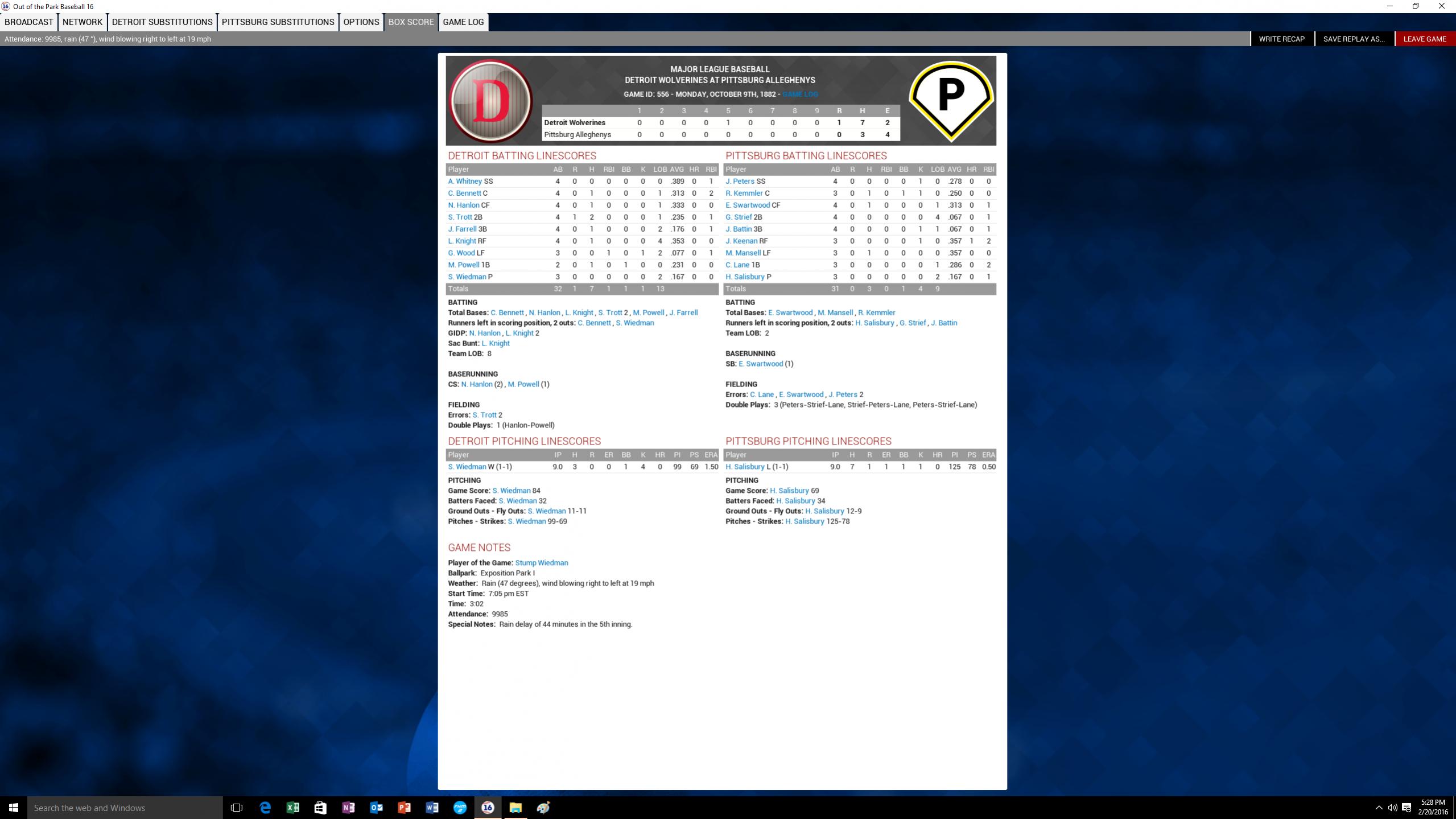 Detroit wins the World Championship Series for 1882 4-2. I disagree with the choice of Wiedman has series MVP. I think Derby pitched just as good. Whitney's 10 hits was impressive as well.