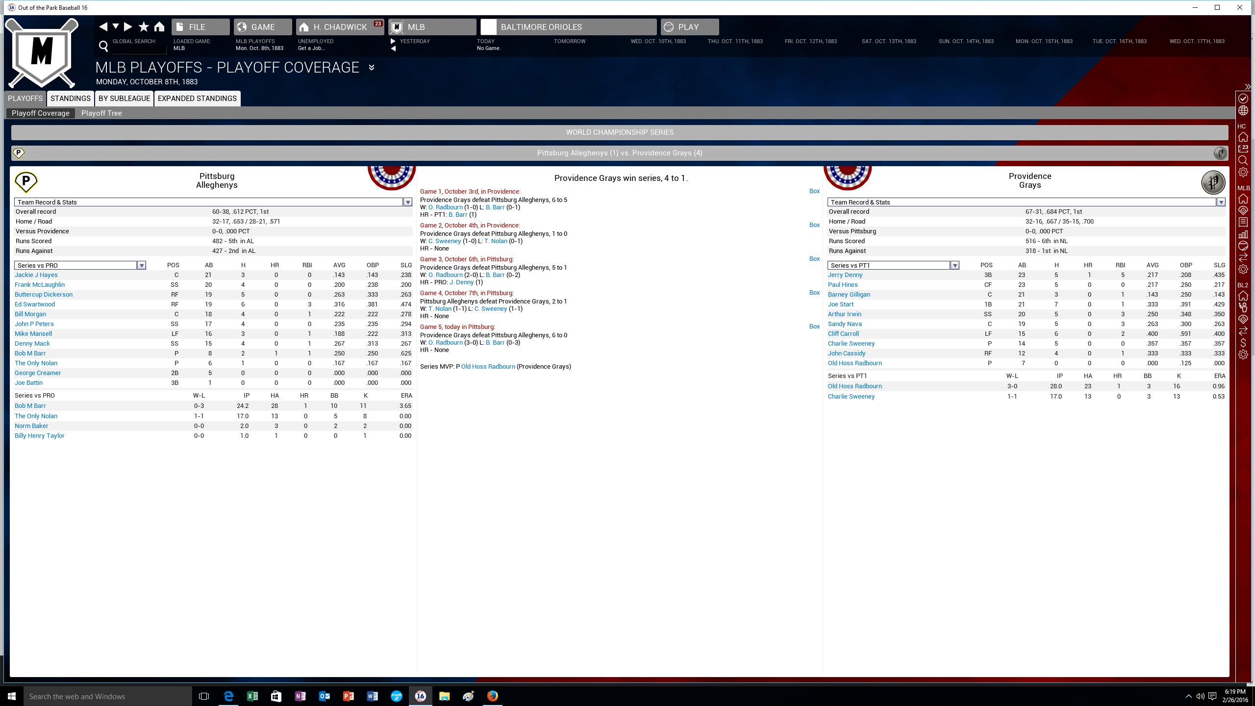 Providence takes game 1 of the 1883 world championship series 6-5 in 10 innings. Old Hoss Radbourn was the MVP. I didnt really think he pitched that great. Especially early in the game. I think his era is deceiving. I think he benefited from the Alleghenys 12 errors.