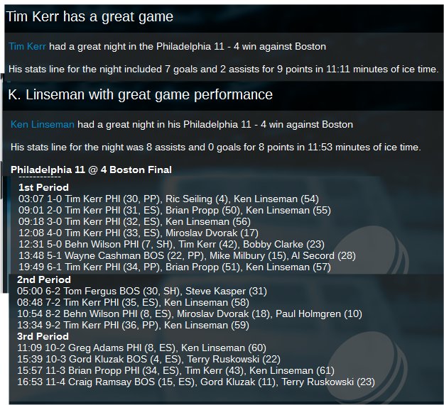 PLAYOFFS There were no surprises in the opening round of the playoffs. Lanny McDonald and Ian Turnbull each had 5 points as Toronto swept Atlanta in 2 games. Vancouver also won in a sweep, winning a pair of close games from their 1970 expansion partner Buffalo. The other two series each needed the full 3 games. Philadelphia rallied with 2 wins over the Islanders after dropping the series opener and Detroit beat Pittsburgh despite a 7 point series from 26 year old Penguins centre Michel Briere. Montreal beat Vancouver in 5 games in one quarterfinal so the Habs will meet Boston in the semi-finals. The Bruins survived a gruelling 7 game series with Philadelphia. The New York Rangers advanced with a 6 game series victory over Detroit. The Rangers will face Toronto in the other semi-final after the Leafs upset Chicago in 6 games despite 12 points from Stan Mikita of the Black Hawks in the series. Chicago goaltender Eddie Johnston had a terrible playoff and at age 40, after 1231 career games and 8 Vezina Trophy's, Johnston's career may just be over. Toronto goaltender Ernie Wakely, at 35 years of age and only a number one goaltender for 2 seasons, had an outstanding series for the winners. The Rangers and Canadiens each won their semi-final series in 5 games. Jean Ratelle was outstanding for the Blueshirts, picking up 11 goals and 22 points in 11 playoff games while Brad Park had 18 points. The Canadiens won over Boston despite a strong playoff from Bobby Orr, who had 18 points in 12 games. STANLEY CUP FINALS The New York Rangers look to win their third straight Stanley Cup and what would be the fourth in franchise history. Montreal returns to the finals after a 4 year absence, the longest drought for the Habs since 1938. The Canadiens have won 14 Cups since the sim started and 18 overall. Despite being two of the original six franchises the Canadiens and Rangers have never met in a Stanley Cup since the sim began in 1931. Steve Shutt and Guy Lafleur each had a goal and two assists as Montreal got goals from 6 different players in a 6-2 victory in Game One. Backup Ken Dryden got the start in net for Montreal and made 23 saves. The Habs take Game Two by a 5-3 score as Lafleur and Shutt each get a goal in the victory. Montreal outshot the Rangers 43-25 in the contest and again got balanced scoring as 5 different players lit the lamp behind Jimmy Rutherford. Jean Ratelle scored twice for New York. The series shifts to Madison Square Garden but that makes no difference to the Canadiens as Montreal outshoots the Rangers 33-17 and wins the Game Three 5-1. Defenseman Carol Vadnais had two goals for the Habs with Lafleur, Doug Risebrough and Guy Charron adding singles. Steve Shutt and Jacques Lemaire each had two assists. Montreal completes the sweep with a 3-0 victory in Game Four as Tony Esposito makes 19 saves for the shutout victory. Guy Charron scores in the first period for the Canadiens with Steve Shutt and Mickey Redmond adding insurance goals in the second stanza. Shutt wins the Conn Smythe Trophy after picking up a playoff leading 25 points in 14 games. His 11 goals are 1 shy of Jean Ratelle's mark of 13. Ratelle also had 11 assists for 24 points. Guy Lafleur (10-13-23) rounds out the top 3 playoff scorers. Other award winners are: HART TROPHY: Stan Mikita Chicago (80GP 48-107-155) VEZINA TROPHY: Bernie Parent Boston (45-15-8, 2.45) NORRIS TROPHY: Carol Vadnais Montreal (80GP 18-85-103) ART ROSS TROPHY: Stan Mikita Chicago (80GP 48-107-155) CALDER TROPHY: Brian Trottier NY Islanders (80GP 18-39-57) The game does not select the all-star team but I will start naming first and second team all-stars Code: