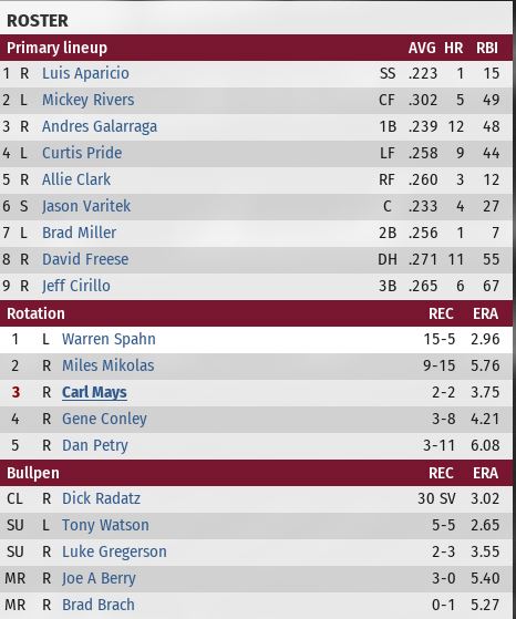 The Beverly’s Road Geese are leading the NC Wildcard race in Silver .262. The Vanderlyle Crybaby Geeks are 1.5 games out of the 2nd Wildcard. There is a real possibility that my two Silver teams will play each other in the Wildcard game. I don’t think I like having multiple teams in the same league anymore. |