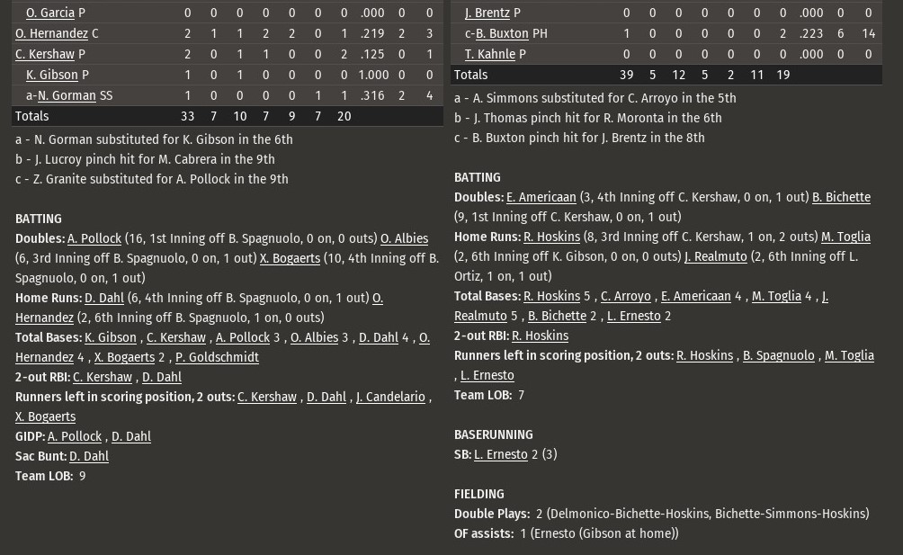 Down 2-1, Columbus scored twice in the top of the fourth and added four more runs in the sixth to carry it to a 7-5 win over St. Louis at Busch Stadium (1997). With the win, the Golden Bears swept their three-game series against the River Walkers. A one-out homer from David Dahl off St. Louis starting pitcher Brendan Spagnuolo tied it in the top of the fourth. Xander Bogaerts followed with a double and scored on a two-out single by pitcher Clayton Kershaw. Spagnuolo went back out for the sixth and immediately got into trouble, issuing a lead-off walk to Bogaerts. Catcher Oscar Hernandez followed with a two-run homer, his second of the season, making it 5-2. Spagnuolo stayed in to face pitcher Kyle Gibson and gave up a single, leading to his departure. Thad Ward took over and allowed consecutive singles to A.J. Pollack and Ozzie Albies. He then issued back-to-back walks to Bryce Harper and Jeimer Candelario to bring in another run. Reyes Moronta replaced Ward and struck out Paul Goldschmidt. However, the fifth walk of the inning Dahl made it 7-2. The Walkers sliced the deficit to 7-5 with three runs in the bottom of the sixth. Home runs accounted for them all, Michael Toglia led off the inning with a homer off Gibson. J.T. Realmuto later hit a two-run homer off Luis Ortiz. The Walkers, however, would not score again. Kershaw pitched four innings, giving up two runs on six hits. He was followed to the mound by six relievers -- Gibson (1.1 IP), Ortiz (0.2), Blake Snell (1.0), Erasmo Ramirez (0.1), Mauricio Cabrera (0.2) and Omar Garcia (1.0) -- with Gibson earning the win, his second of the season, and Garcia notching his 12th save. |