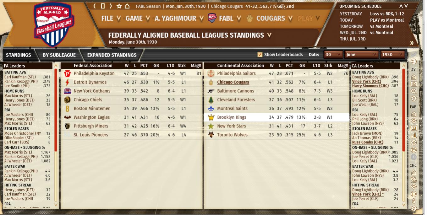 Chicago Cougars (33-28): 10 Montreal Saints (29-31): 7 W: Chick Meehan (5-2) L: John Barrie (3-5) SV: Len Moore (5) We stopped our little skid and topped the Saints in game three. John Dibblee was excellent, 4-for-5 with a double, run scored, and 5 RBI's. Russ Combs was 4-for-6 with 2 runs, a steal, and RBI. Mack Deal was 1-for-3 with a steal, sac-bunt, run, and RBI. Vince York was 1-for-4 with a double, walk, and 2 runs scored. Bill Ashbaugh was 1-for-3 with 2 walks, 2 runs, and an RBI. Dick Kadlec was a little unlucky in the start, 5 innings with 6 hits, 7 runs (3 earned), 4 walks, and 4 strikeouts. Chick Meehan picked up the win, 2 innings with a hit, walk, and strikeout. Len Moore picked up the save, 2 innings with 3 hits and a strikeout. June 17th, 1930 Chicago Cougars (34-28): 4 Montreal Saints (29-32): 0 W: Max Wilder (5-4) L: John Lizak (0-1) Former Saint Max Wilder was unhittable as we shut out the Saints 4-0 to end our road trip with a series split. He allowed just 3 hits and 3 walks with 6 strikeouts in the complete game shutout. He also went 1-for-4 with a run scored. Russ Combs went 4-for-5 with a steal, run scored, and RBI. Vince York was 2-for-5 with a two run homer. George Jordan was 1-for-3 with a walk. June 19th, 1930 Baltimore Cannons (33-30): 7 Chicago Cougars (35-28): 8 W: Dick Lyons (7-6) L: Rabbit Day (10-7) SV: Len Moore (6) Fresh off a day off, we survived the visiting Baltimore Cannons 8-7 to start our homestand. Vince York was 2-for-3 with 2 walks, 2 RBI's, and his 10th home run of the season. He becomes the first Cougar to hit double digits for homers this year. Mack Deal went 3-for-4 with a double, run scored, and 2 RBI's. Fred Barrell was 3-for-5 with an RBI. Bill Ashbaugh was 2-for-4 with a walk, run scored, and RBI. George Jordan was 1-for-3 with a sac-bunt and solo home run. John Dibblee was 1-for-4 with a double, 2 runs, and a walk. Russ Combs was 1-for-4 with a walk, run scored, and RBI. Lyons allowed a remarkable 17 hits with 7 runs, 2 walks, and 2 strikeouts in 6 innings. Chick Meehan pitched 2.1 innings with 2 hits, a walk, and 3 strikeouts. Len Moore got the final 2 outs for the save. June 20th, 1930 Baltimore Cannons (34-30): 7 Chicago Cougars (35-29): 3 W: Ken Carpernter (9-6) L: Tommy Russel (5-6) The Cannons evened the series back up with a 7-3 win. As per usual, Tommy Russel pitched the entire game. He allowed all 7 runs (3 earned), with 8 hits, 2 walks, and 2 strikeouts. Harry Simmons was 3-for-4 with an RBI. Russ Combs was 2-for-3 with a sac-bunt. Art Panko was 2-for-4. John Kincaid was 1-for-4 with a run scored and RBI. June 21st, 1930 Baltimore Cannons (34-31): 6 Chicago Cougars (36-29): 8 W: Dick Kadlec (5-5) L: Bob Miller (7-8) Despite a ninth inning rally, we held off the Cannons in an 8-6 victory. Vince York was a perfect 4-for-4 with a hit by pitch, run scored, and 2 RBI's. Russ Combs was 3-for-5 with 2 runs and 2 RBI's. Bob McCarty and Harry Simmons were both 2-for-4 with a run scored, walk, and RBI. Dick Kadlec was 1-for-3 with a run scored and sac-bunt. He also pitched to a complete game victory, allowing 13 hits and 6 runs with 2 walks and 2 strikeouts. June 22nd, 1930 Baltimore Cannons (35-31): 5 Chicago Cougars (36-30): 4 W: Buzz Ham (5-1) L: Len Moore (2-2) SV: Lee Drouillard (6) A 3 run 8th game the Cannons the finale as they left Chicago with a series split. George Jordan was 2-for-4 with 2 RBI's. Vince York was 2-for-5 with a run scored and two driven in. Bill Ashbaugh was 1-for-3 with a walk. John Kincaid was 1-for-4 with a walk and run scored. Max Wilder went 7+ with 5 hits, 4 runs (3 earned), 6 walks, and just 1 strikeout. Len Moore got the loss, 2 innings with 2 hits and a run. Stars of the Week Vince York : 25 AB, 12 H, 2 HR, 8 RBI, .480 AVG, 1.312 OPS Russ Combs : 28 AB, 15 H, 0 HR, 5 RBI, .536 AVG, 1.087 OPS John Dibblee : 9 AB, 5 H, 0 HR, 5 RBI, .556 AVG, 1.414 OPS Weekly Summary A 4-2 week puts us in 2nd place, 8 behind the Sailors and 1 ahead of the Cannons. We also finished our road trip 9-5 against Baltimore (35-31), Brooklyn (32-32), New York (29-37), and Montreal (33-33). I'm really happy with the results of this trip and 6 games over .500 towards the end of June is an awesome return from last year. We've already hit our half way win point far before the half way point in the season. Vince York jumped up to third in the Continental Association (and the entire league) in batting average with a .383 mark. He's also the first of our hitters to reach the double digit mark for homers. He leads all rookies with that number, as well as OBP (.424), OPS (.989), WAR (2.4), hits (105), total bases (155), OPS+ (137), and wOBA (.423). He also sits second in WPA (2.22), RBI's (48), and slugging (.566). In contrast to York, Dick Lyons has been enduring an awful season. He may be 7-6, but he has a 5.42 ERA (89 ERA+), 1.61 WHIP, and 38 strikeouts in 106.1 innings. The ERA, ERA+, and WHIP would be career worsts, and his 0.7 HR/9 is also the worst mark of his career. He's been overshadowed by Max Wilder, who is 5-4 with a 3.48 ERA (138 ERA+), 1.27 WHIP, and 51 strikeouts in 116.1 innings. Lyons really needs to step it up after we lost McSherry for most of the season last week. Speaking of the McSherry injury, the FABL's 35th ranked prospect Jim Crawford will be set to make his debut in the first of a four game set with the Stars. Acquired from Sacramento in the Independent league draft, Crawford has been excellent with the Blues, going 4-4 with a 2.88 ERA (145 ERA+), 1.28 WHIP, and 76 strikeouts in 81.1 innings pitched. The lefty Crawford has top of the rotation potential and may be up to stay if he shows that he's ready for the majors. The Stars series is a three game set followed by four more at home with the Brooklyn Kings. The homestand ends with three against the Saints before a travel day to Philadelphia. We'll start that series with a double header against the first place 43-21 Sailors. Injury Report LF John Dibblee (Chicag