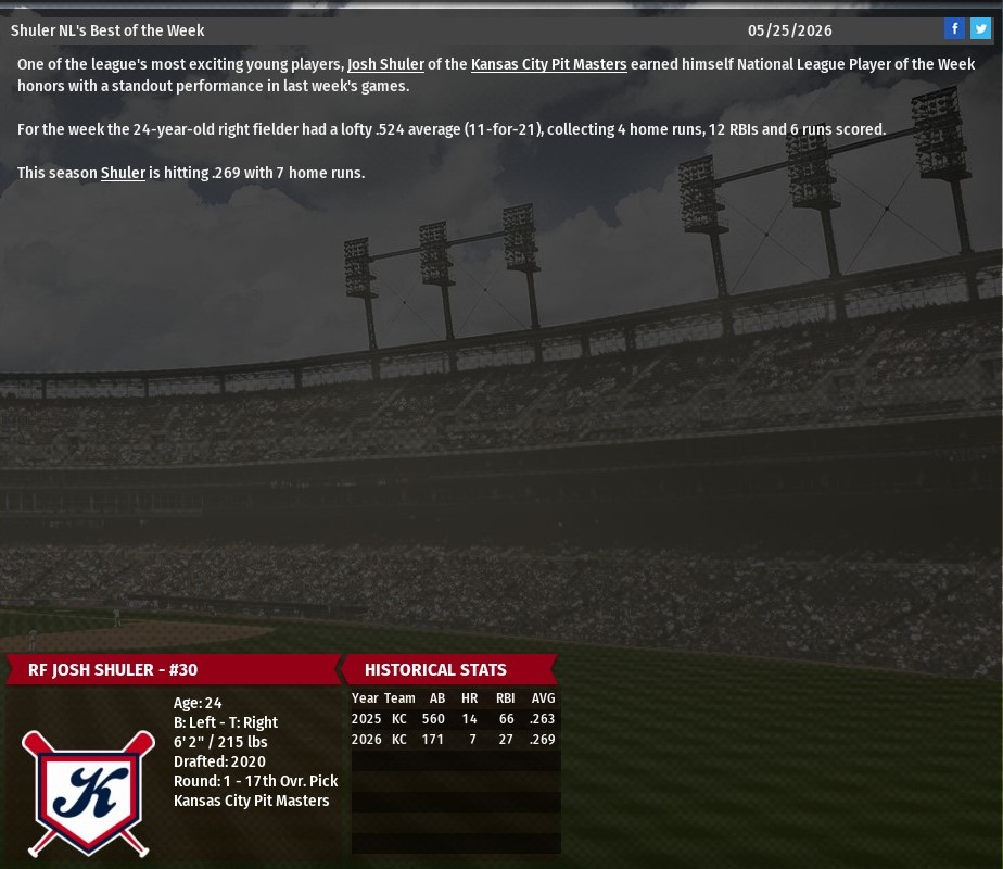 Down 1-0,Rhys Hoskins put St. Louis in the lead with a two-run homer in the bottom of the fourth inning and the River Walkers added five more runs in the next inning to send them to an 8-2 win over Kansas City at Busch Stadium (1997). The victory allowed the Walkers to salvage the finale of the three-game series. Carlos Vidal had drawn a lead-off walk from Pit Masters reliever Nick Goody to open the bottom of the fourth. Archie Bradley then replaced Goody and the fifth pitch he threw to Hoskins was smacked 414 feet over the wall in left-center to put St. Louis in front. Kansas City starting pitcher Jo Jo Romero had departed after two innings with a finger blister forcing the Masters to turn to their bullpen early. Romero is expected to be out for two weeks. The Walkers bludgeoned the K.C. bullpen in the fifth. However, it got started when pitcher Tanner Bibee was hit by a Noah Murdock pitch to leadoff the inning. Bo Bichette followed with a single and Carlos Vidal scored them both with a double. Johan Camargo drove in the inning's third run with a single off Kyle Nelson. Jared Thomas plated the final two with a double off Austin Hansen. Replacing the injured Jimmy Lambert in the St. Louis rotation, Bibee turned in a third straight strong start. He worked into the seventh inning, allowing two runs on nine hits in 6.2 innings. He struck out eight and walked one. Rookie Justin Roberts got the final out of the seventh. Danny Grigg retired six in a row to breeze through the eighth and ninth. |