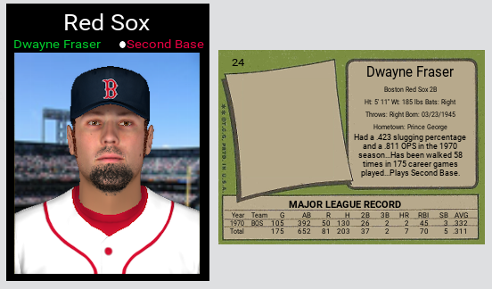 Team Name W L % STR GB R H R AVG SB ERA HR/9 BB/9 K/9 PCT ZR Att Boston Red Sox 77 60 .562 L4 6½ 602 112 .262 56 3.20 0.7 3.0 6.7 .981 15.5 1,168,101 Rotation: Honestly, there's not much to change here. Chris Messina (7-6, 2.31) will probably be the guy pulled when Davila returns. He's been very good as a starter (5-5, 2.34) although he's striking out just 3.2 guys per 9 innings in that role and so I wonder if he'll be able to keep that up. He'll only have to continue the good run for another start or two. Bullpen: Things are already set pretty well. The Red Sox have by my count 5 "plus" relievers already and will add a 6th when Messina moves here. If this was 1995, this would be amazing. Infield: 3B Edwin Madriles (.283, 6, 28) has clearly outhit Mauro Magoni (.254, 6, 36) but there's a part of me that still thinks I cut bait on the 2+ year Sox starter too soon. Then I look at his history and I see that outside of a good 1968 (.293, 10, 63), he's really never been all that good. So Madriles stays. We'll take another look come spring training. I'm not about to bench SS Oniji Handa (.283, 21, 76), who in addition to the big stats is basically Mark Belanger in the field, but he's been hitting 4th and it seems like he's been a bit overmatched there (.253, 8, 30 hitting cleanup vs. .299, 13, 46 batting 2nd). The thing is, even Handa trying to do too much (which I don't think is a thing in OOTP but you just *know* people would make excuses like this IRL) is better than anything else the Sox can throw at the 4 hole so at least for the remainder of 1970 I think he has to stay here. Outfield: LF Josh Teague (.232, 11, 35) has done nothing this year and is pretty much only in right now because Matt Wilson (.280, 3, 24) is nursing a strained back. I mean, I actually prefer Teague's power in the corner outfield - he hit 25 HRs last year - but he never walks. You know what? I think I'll probably leave him in at left. He is a .269 career hitter, after all. RF Jun Kim (.252, 16, 62) is another guy who's "tried to do too much" with the Bosox after coming over from the other Sox in the offseason. Like Handa though, there's "I'd prefer him to be better" and there's "I have a replacement" and those are two very different questions. Also, like Handa, Kim is a plus-plus fielder.