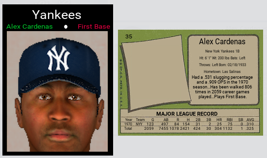 --------------------- ALCS -------- The Yankees really have their work cut out for them: not only do they have to win out to advance to the World Series, they're going to have to win both of the next two games at Metropolitan Stadium in Minneapolis. Major Transactions --------------------- None. News -------------------- October 7: General Juan Jose Torres becomes the new "president" of Bolivia. Ever hear of "Operation Condor"? That's this guy. Game Infos -------------------- Yankees @ Twins Pregame: Metropolitan Stadium is basically a neutral park this year, although lefties can find it hard to hit homeruns in the cold Minnesota air (it didn't seem to affect righties as much for some reason). It's an open park that seats 45k rabid Minnesota sports fans. It's 55 degrees out with a wind blowing out to center. I don't know if that means more runs or fewer to be perfectly honest. Probably fewer. One small thing the Yankees have going for them is that their ace Tracy Mosher (25-12, 2.67) is available to pitch in this game. He'd been dispatched to take down the Indians in the one-game playoff so this is his first start in the postseason this year. He's actually got some postseason experience: 5 games, 4 starts, a 1-0 record, and a 4.76 ERA. All right, not good experience but experience... Mosher led the league in wins for the 2nd time in 3 years and has a lifetime record of 146-82 with 6 All-Star mentions. The left-hander simply knows how to pitch and just plain destroys people with a devastating change of pace. The 163rd game actually allowed Mosher to set the modern record for innings pitched with 323. That start also allowed him to become the first SP since 1958 to complete 20+ games in one year. Mike Larsen (11-10, 3.04) is a junkballer who keeps the ball down - 60% GB rate, only 8 HRs allowed in 201 IP. His control wasn't quite at its pinpoint best this year (3.3 BB/9, a career high), which is why he was only 11-10 and not, say, 15-8 like he was in 1968 when he made his only All-Star appearance. That said, he finished the season strong: a 2.44 ERA in 44.2 September innings (only a 2-2 record but that's not all his fault). Top 1st: MacMillan walks. Weiss lines out to left field - Alejandro Cortes makes an excellent play to prevent a hit. Cardenas flies out to center. Meneses singles to left. Dan Field parks his first postseason HR into the right field stands. I swear I mentioned that Larsen doesn't give up very many of those. Tabb hits a blooper that falls in front of CF Jose Villasenor for a base hit. Pat Jones flies out. Yankees 3, Twins 0 Bottom 1st: Morgenstern strikes out swinging. Pellot grounds out to third. Martinez gets jammed and flies out to left. Yankees 3, Twins 0 Top 2nd: Yi gets things start with a triple to left-center. Mosher strikes out; that's Larsen's first. MacMillan homers to right. This is not Mike Larsen's day. Weiss flies out to center field. Cardenas actually hits one on the ground - it goes to shortstop and the play is scored 6-3. Yankees 5, Twins 0 Bottom 2nd: Brookes flies to center. Cortes pops out to second base. Villasenor strikes out swinging. Yankees 5, Twins 0 Top 3rd: Larsen gets behind Meneses and then plunks him in the back. That's 3 straight leadoff men reaching base off Larsen. Meneses, who stole 7 bases in 10 tries in 1970 and in the past has stolen as many as 15, get caught trying to take second. Field flies out to center. Tabb strikes out. Yankees 5, Twins 0 Bottom 3rd: Reed strikes out looking. Mendel grounds out to short. I could bring Larsen out but I do not; he strikes out too to retire the side. Yankees 5, Twins 0 Top 4th: Jones strikes out. Yi climbs the ladder and chases a 3-2 pitch out of the zone for Larsen's 2nd K of the inning and 4th of the game. Mosher bloops one into left for a single. Micah MacMillan also singles and Mosher gets over to third on the play. Tommy Weiss slaps a hit just past Danny Pellot at shortstop, driving in Mosher and getting MacMillan over to third base. Cardenas grounds out to second. Yankees 6, Twins 0 Bottom 4th: Morgenstern grounds out, 5-3. Pellot hits an easy fly to left. Martinez drops a kind of cheap one in between the infield and the outfield for the first Twins hit of the game. Brookes flies out to center field. Yankees 6, Twins 0 Top 5th: I'm probably going to lift Larsen for a pinch-hitter the next time he's up but that might not be until the 6th. He may not make it that long. Meneses grounds to second. Field pops up to Marty Mendel at second. Tabb slaps a 2 out single back through the box. Jones grounds out to second. Yankees 6, Twins 0 Bottom 5th: Mosher strikes out Cortes with a big, breaking curveball that is so slow, your car could probably beat it to home plate. Villasenor singles into right. Reed hits it to second and gets doubled up, 4-6-3. Yankees 6, Twins 0 Top 6th: With the bottom of the order now due up, why not let Larsen get through 6? Yi grounds to first base. Mosher hits one back to the pitcher that is fielded cleanly for the 1-3 groundout. MacMillan does sort of the same thing, only the grounder isn't quite as hard and MacMillan is much faster down the line, so it winds up an infield base hit. Weiss grounds out to second. Yankees 6, Twins 0 Bottom 6th: Marty Mendel flies out to center field. Pinch-hitting for Larsen is Mike Grigg. He grounds out to second. Morgenstern hits one that gets to the warning track in left but is just a loud out. Yankees 6, Twins 0 Top 7th: With two lefties due up, the Twins go to LHP Ricardo Magdaleno (8-16, 4.73). As the record suggests, Magdaleno spent most of the season in the rotation, and as the record suggests, he was kind of bad. He yielded a .295 OBA this year; he stopped being able to strike people out last year and in retrospect he just might have been lucky to still go 13-8, 3.14 for the club then. Cardenas belts it to deep center but Twins CF Jose Villasenor manages to track it down for the out. Meneses lines out to shortstop. Field strikes out.