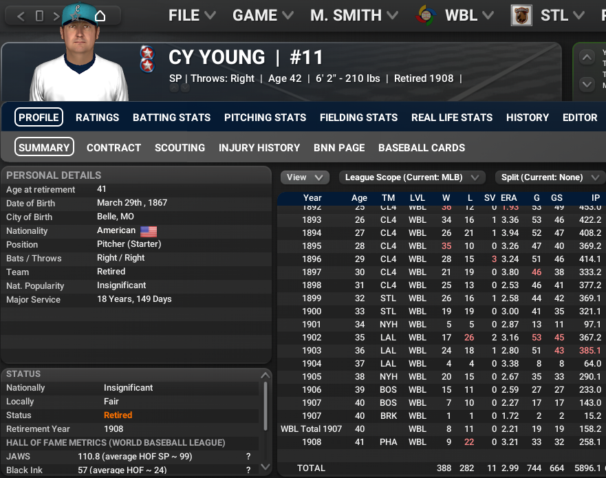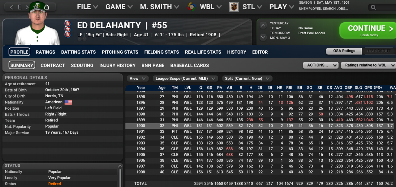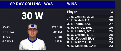Rube Waddell has had one of the best careers of any WBL player. But he is on a very bad Boston Battalions team in the process or rebuilding and he currently leads the league in losses despite a good ERA. The Boston pitcher has 2 Ace Awards and has made 5 All-Star teams.