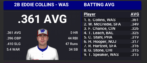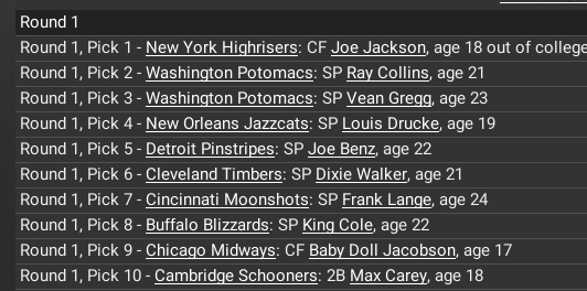 Assuming the Potomacs sign their #1 pick, Shoeless Joe Jackson, they may well have Eddie Collins, Tris Speaker and Joe Jackson in the heart of the order as soon as next year. The Potomacs had a good draft, picking up Larry Gardner in Round 2 and catcher Tommy Clarke in Round 3. Eddie Collins is leading the majors with a .361 average at age 20.