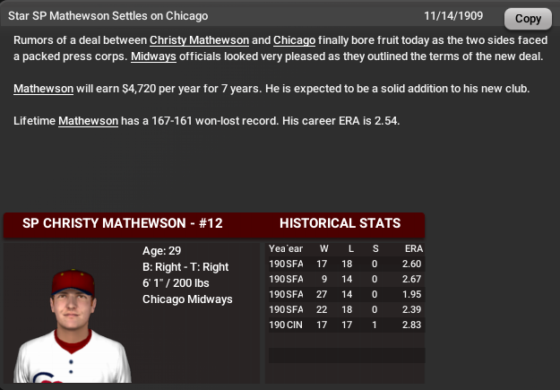 A lot of moves made in the offseason including Chicago signing free agent Christy Matthewson. Big Six will join the Big Train at the top of the World Champion's rotation. That could be a very good team in 1910. Baltimore lost Eddie Plank and Hooks Wiltse from their rotation but were able to trade for Boston's Rube Waddell and Philly's Nap Rucker.