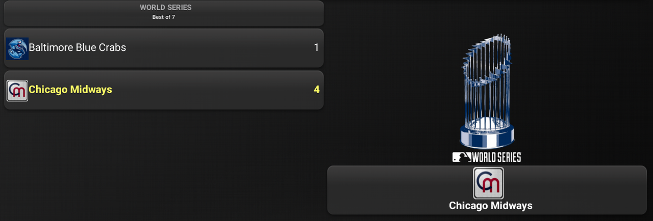 After 3 straight world championships, the St. Louis Clydesdales fell to the Baltimore Blue Crabs 4 games to 1 in the 1908 World Series. It was a difficult road for Baltimore who had to beat surging Buffalo in the Eastern League in a one-game playoff to get there.Jack Lelivelt, who had a big season for the Crabs, was the Series MVP.