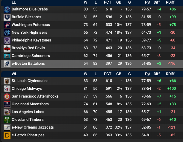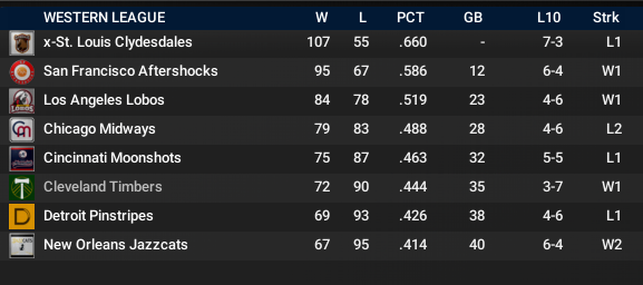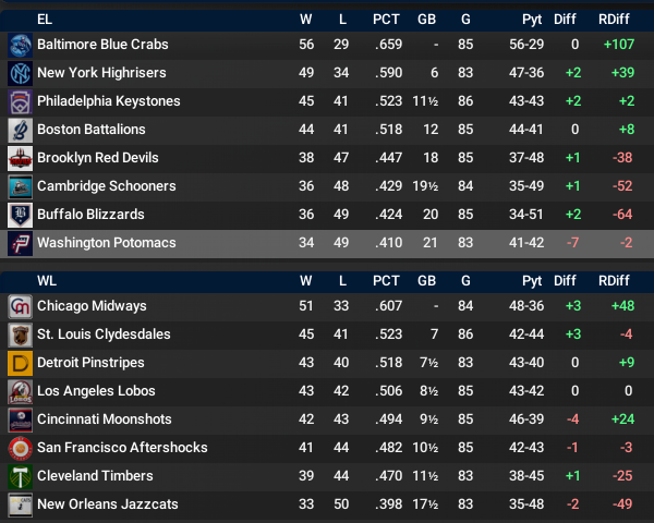 St. Louis and Baltimore have small leads heading into September. The WBL has not had many close pennant races so far in its history. Could see one this year though as both first-place teams have been a bit lucky so far. Run differential suggests that St. Louis will have to work hard to get to a 4th straight World Series. Then again, Walter Johnson has been out for Chicago and Buffalo definitely seems like a vulnerable rotation.