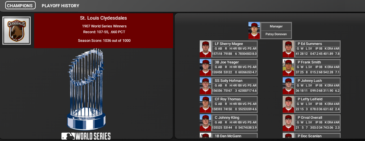 The St. Louis Clydesdales set a new league record, winning 107 games. They will play Brooklyn in the Series as they try to win their third straight championship. What is amazing is that team still does not have a real superstar. The team had no MLB Hall of Famers in 1905 or 1906 when they won it all and their only Hall of Famer this year is Three Finger Brown who they acquired from NY and who did not start a game for the Clydesdales.