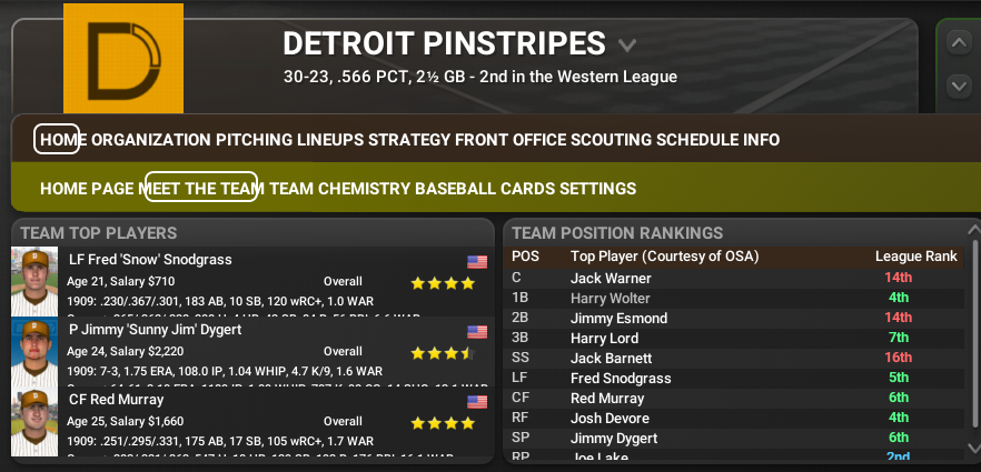 After seven straight last or second-to-last finishes, the Pinstripes may be on to something. They are in 2nd place and 3.5 back of Chicago. They probably aren't ready quite yet but with Josh Devore, Fred Snodgrass, Fred Merkle, Red Murray and Jimmy Dygert, they have some good young talent. Plus they have the #1 pick in the draft and Pete Alexander is available.