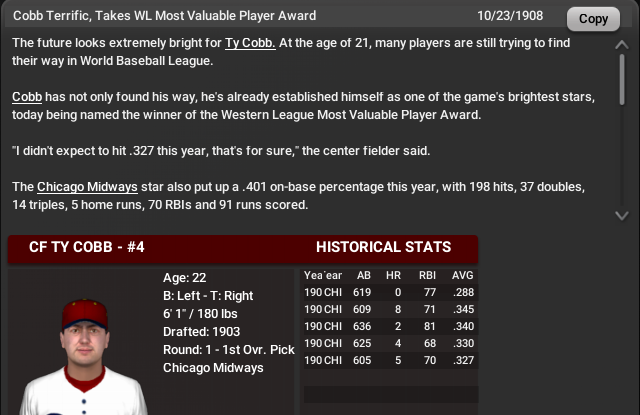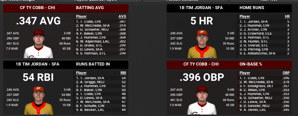Barry Bonds won 7 MVPs in the MLB. It will be interesting to see how many Cobb wins in the WBL. In 1909, Cobb is 22 years old and he has already won the MVP in 1905, 1907 and 1908. This year his team is leading the Western League by a wide margin and he has a big lead in the batting race and in WAR. He could well be headed into his 23 year-old season with 4 MVPs already.