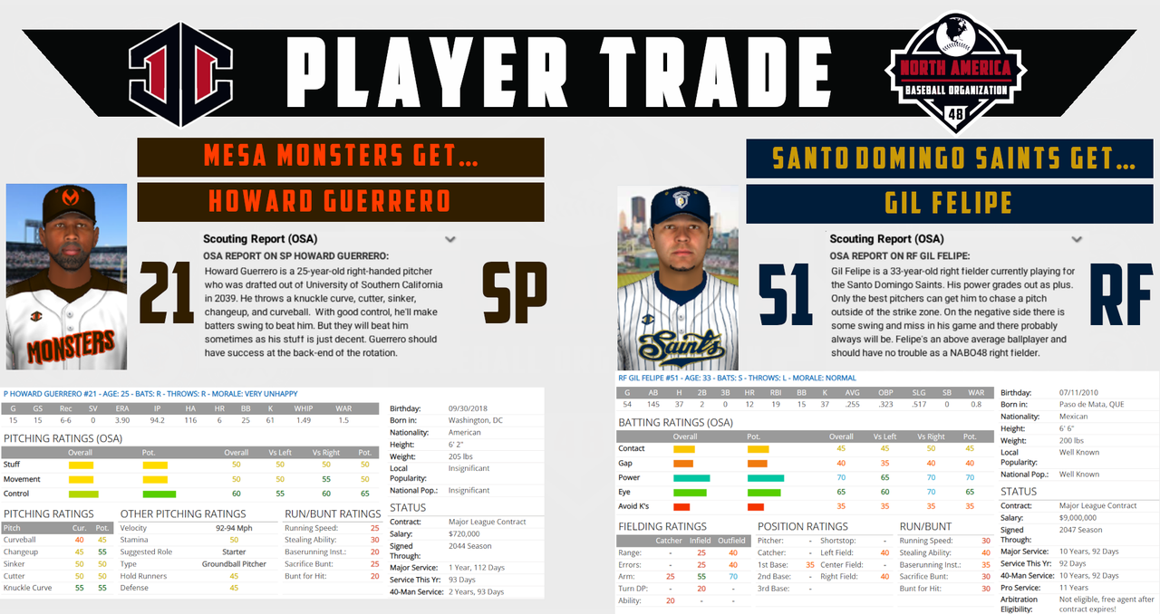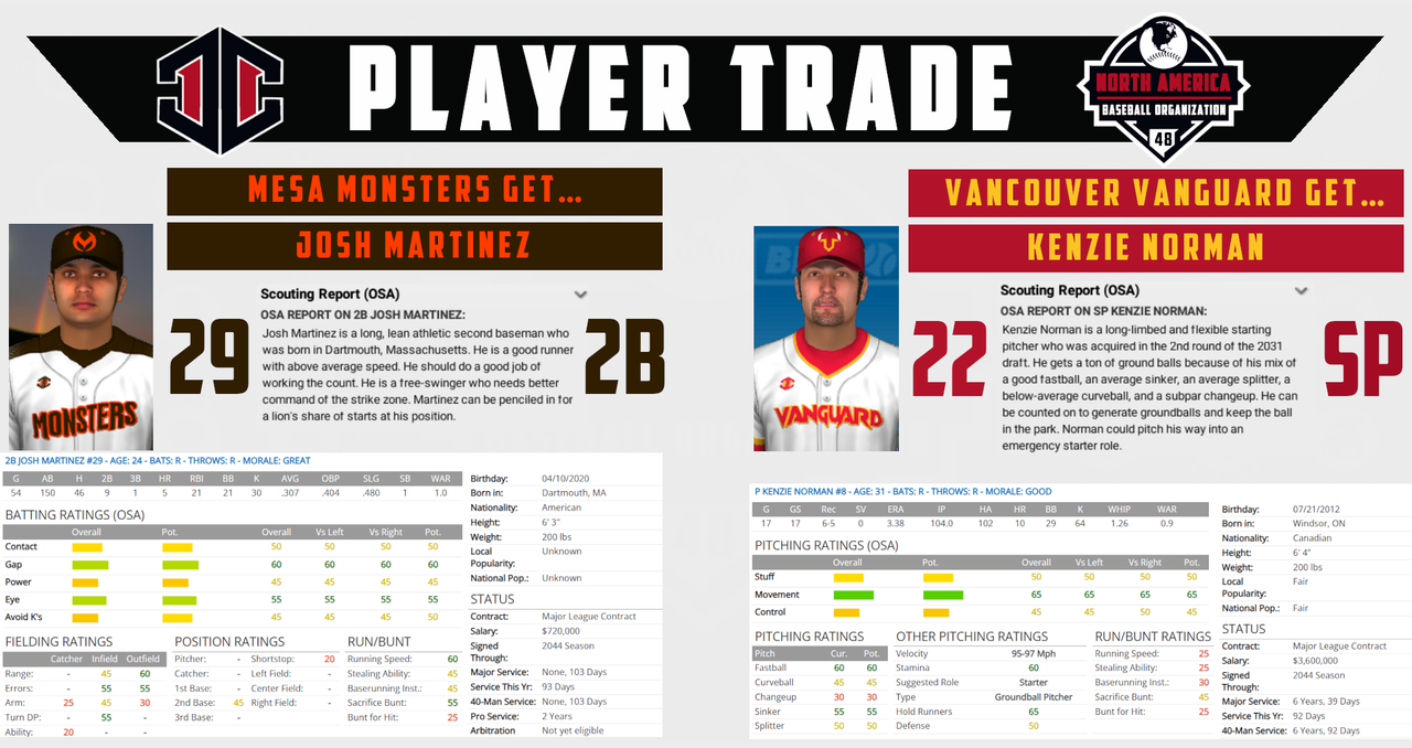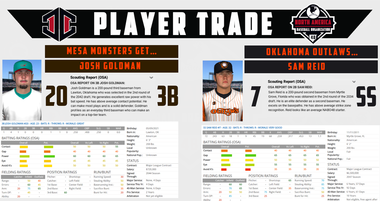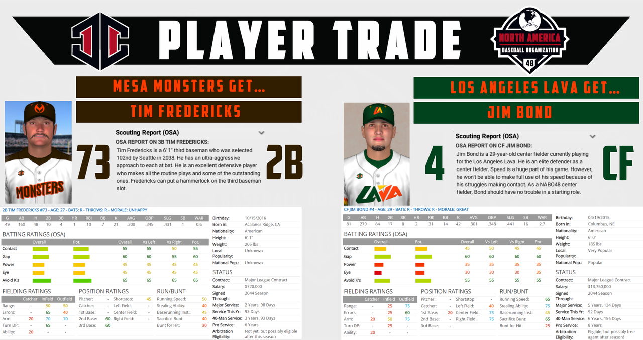 This one was devastating for the fans (and GM), as fan favorite CF Jim Bond was traded to rival LA. Bond, who will likely win his 3rd straight GG in CF this year wanted 20M/y for 5 years as an extension, and Mesa wanted to use the money for other things. Mesa has 2 solid options in 3A to replace Bond, offering more OPS, but lesser defense. Fredericks is a solid IF piece that can play all position other than C. He will likely starts at SS, sharing time with Emmanuel Reyes.
