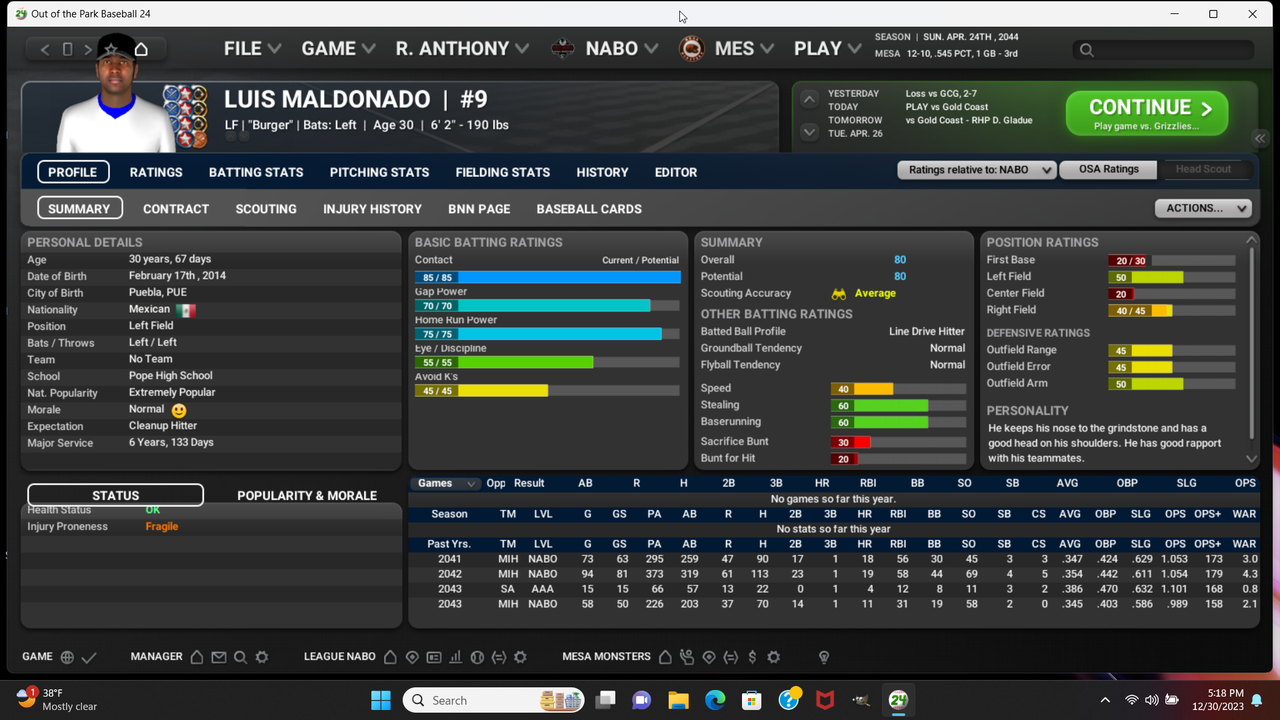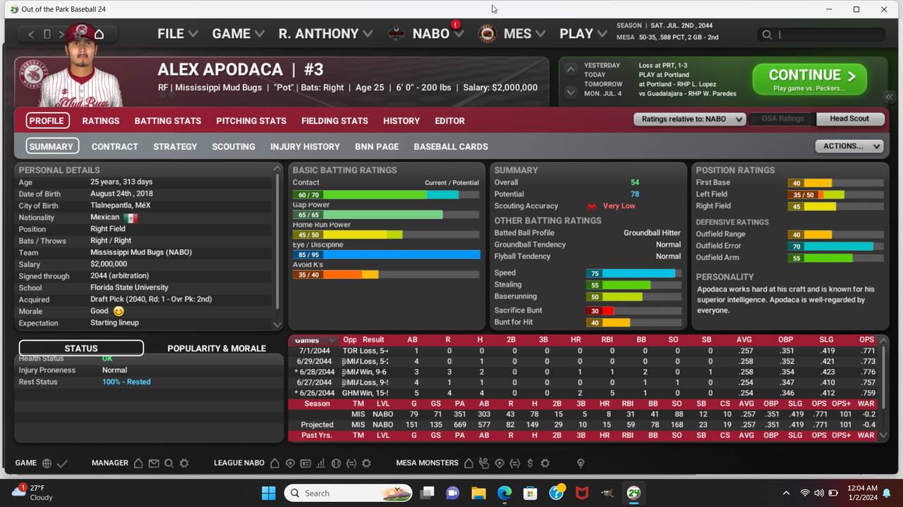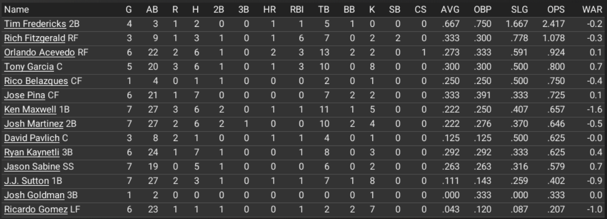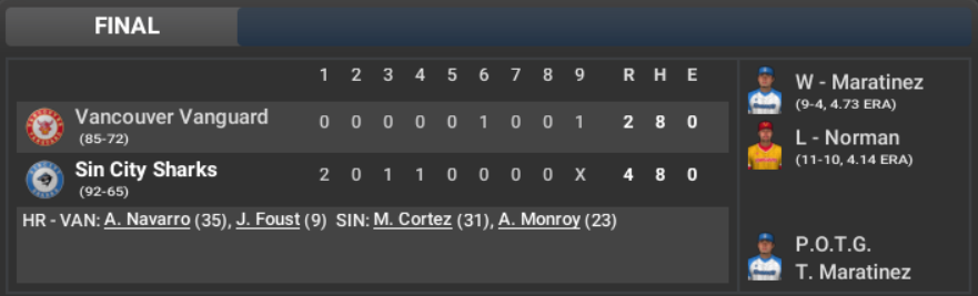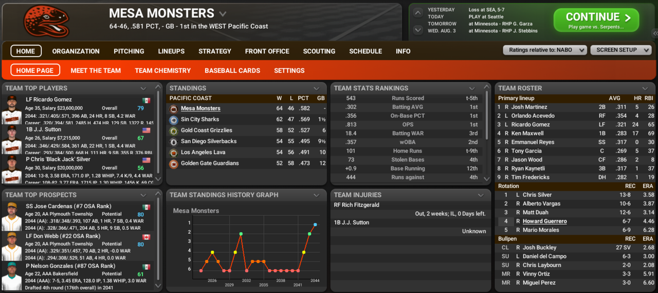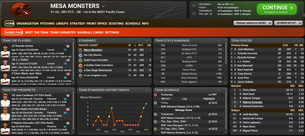 Anyway, RF Fitzgerald, having a great season, got injured and I brought up RF Orlando Acevedo from 3A ... essentially making RF Gil Felipe expendable. I clicked to make a trade or shop a player to see what I could get for him, and I liked some of the results. So I made a trade. Then explored with another player, and another player, and another player ... and ended up replacing players near the end of their contract or down on the depth charts for younger players for less money, while trading some defense for a bit more OPS. Of course, the Mesa fans hated every move.
