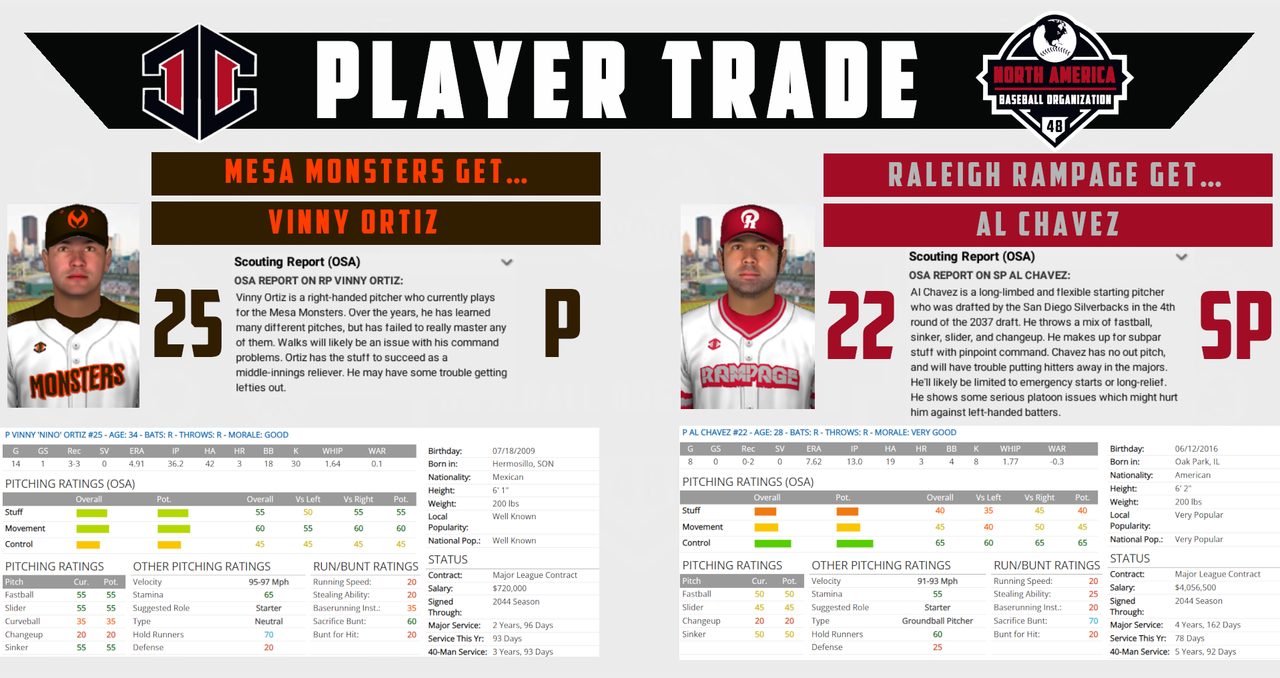 Ortiz will serve in the bullpen in 2044 and possibly move to the rotation in 2045. Chavez was struggling in the pen, and well overpaid. Fans reacted like we just traded our ace.