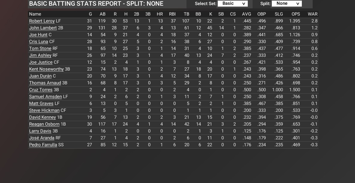 1. SP Bill Clary (Age: 28, Overall : 3.0, Potential: 3.0) 2. RF Stan Gillis (30, 3.0, 3.0) 3. LF Melvin Akerval (26, 3.0, 3.0) 4. 1B Mal Johnston (22, 3.0, 4.0) 5. SP Joo-seok Kim (27, 3.0, 3.0) Game #1 - Friday June 9th, 2056 Chicago 30-27 @ Detroit 28-29 RHP Yale Hulbert (2-1, 8.40 ERA) vs LHP Dwayne Miller (4-3, 4.88 ERA) A - 28,045 Juan Durán caps a four-run Chicago first with a two-run home run. Yale Hulbert looked to be back in form (6IP 4 H, 2 R, 2 BB, 6 K) and three Tects relievers make those runs hold up. Chicago 6, Detroit 2. RF T Stone 2-4 DB 2R, LF R Leroy 2-4 R, RBI, BB, DH L Davis 2-4, SS Mulford 2-3 HR - CH C J Duran (6), 1B R Osborn (11), Det - 1B M Johnston (11) POTG - Chicago SP Yale Hulburt (1) Friday, June 9th , 2056 - Chicago Architects: SS Kennelly Mulford was injured while running the bases. The Diagnosis: hip flexor strain. This is a day-to-day injury expected to last 2 days. Mulford left the game but was able to start the next day. Friday, June 9th , 2056 - Chicago Architects: Thomas Arnaud has suffered a setback in his recovery. He is not expected to recover for another 4 weeks. Game #2 - Saturday June 10th, 2056 Chicago 31-27 @ Detroit 28-30 RHP Yale Hulbert (3-1 6.86 ERA) vs LHP Bryan Miller (3-5, 7.41 ERA) A - 23,818 Detroit scored four in the first, with Art Loder hitting a two-run slam. Chicago ties things in the third, with Tom Stone hitting a grand slam. The Tects then take a 5-4 lead in the fifth. There only lead of the game is quickly erased. The T-Birds score six times in the bottom of the fifth. Melvin Akerval homers, Loder singles in a run, Dai-Lin Tah and Alan Stout single in runs, and Larry Thomson singles in two. Detroit 11, Chicago 6. DH L Davis 2-2 2BB 2R, LF R Leroy 2-4 RBI, HR - CH RF T Stone (4), Det - DH A Loder 2 (8), LF M Akerval (7) POTG - Detroit DH Art Loder Game #3 - Sunday June 11th, 2056 Chicago 31-28 @ Detroit 29-30 RHP Jose Cedeño (7-1, 3.33 ERA) vs RHP Joe. Davis (1-3, 3.68 ERA) A - 25,100 The T-Birds score twice in the first, twice in the second, and twice in the third. Mal Johnston and John Nichols homer. Art Loder singles in a run. More surprisingly, he steals two bases. Detroit 9, Chicago 6. RF J Justice 2-5 DB HR R 3RBI, SS Mulford 1-4 3RBI HR - CH - RF J Justice (5) Det - 1B M Johnston (12), CF J Nichols (9) POTG - Detroit DH Art Loder Quote: