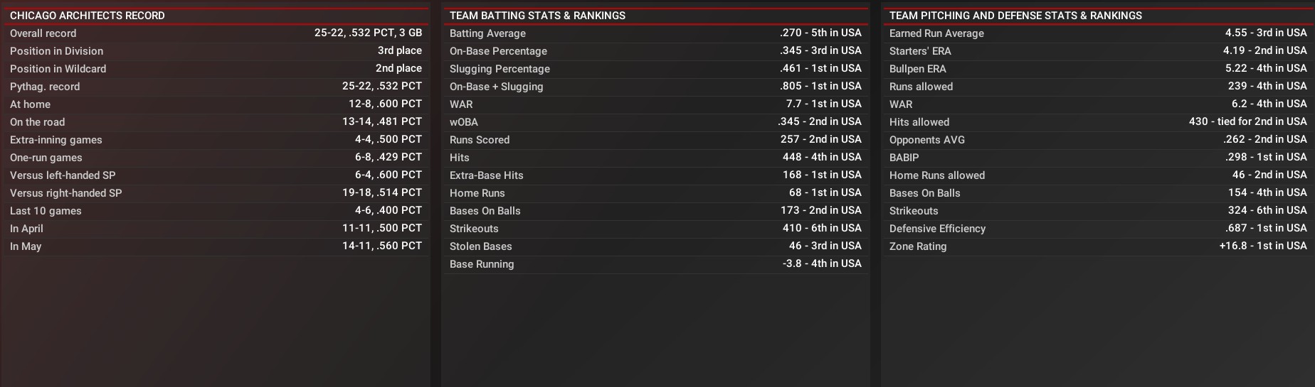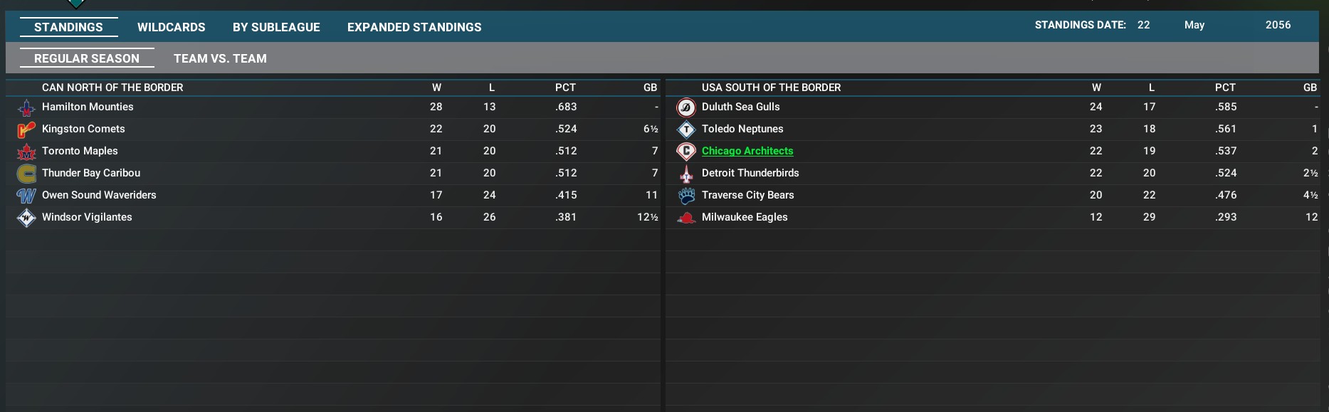 Back to Division Play with 6 Big Games Heading into Memorial Day we have a big home series against the Detroit Thunderbirds (25-22) who are still annoyingly hanging around. Not only are we tied with them in the standings, we find ourselves in a 3-way tie with Toledo at 3 games back of 1st place Duluth. May 29th through 31st 2056 Detroit Thunderbirds 25-22 T-2nd in US vs Chicago Architects 25-22 T-2nd US Chicago’s Pier IV Grounds We have a 3-game series at home against the Detroit Thunderbirds kicking off today. Here is my report on the opponent: Going 25-22 so far this year, the Thunderbirds have compiled a .532 winning percentage. They are in 4th place in the South of the Border, 3.0 games behind the leader. Their number of runs scored of 249 rank 3rd in the USA, their .283 batting average ranks 1st. On the other side of the diamond, they have given up 236 runs (3rd) with their starters compiling an ERA of 4.96 which ranks 5th. Their bullpen sports an ERA of 5.04, ranking 3rd. When playing against our Architects this season, they have a record of 0 wins and 6 losses. Here are the projected pitching matchups, our pitchers listed first: RHP V. Imbert (3-3, 3.74 ERA) vs LHP D. Miller (3-2, 4.72 ERA) RHP T. Noble (3-0, 4.09 ERA) vs LHP B. Miller (3-4, 6.28 ERA) RHP M. Inoue (5-4, 3.21 ERA) vs RHP B. Xian (1-4, 6.85 ERA) The top 5 players on their team are: 1. SP Bill Clary (Age: 28, Overall : 3.5, Potential: 3.5) 2. RF Stan Gillis (30, 3.0, 3.0) 3. LF Melvin Akerval (26, 3.0, 3.0) 4. 1B Mal Johnston (22, 3.0, 4.0) 5. SP Joo-seok Kim (27, 3.0, 3.0) Game #1 - Monday May 29th, 2056 Detroit 25-22 vs Chicago 25-22 LHP Dwyane Miller (3-2, 4.72 ERA) vs RHP Val Imbert (3-3, 3.74 ERA) A - 35,052 Detroit scored six runs in the first: four walks, a two-run Trace Brunel double, a walk, and a three-run Dai-Lin Tah double. Chicago starts to chip away the lead, but Detroit puts up a five-spot in the sixth with former Architect Art Loder hitting a grand slam. Detroit 14, Chicago 11. RF T Stone 4-5 DB HR 2r 4RBI BB SB, 1B R Osborn 3-3 HR R 2RBI 3BB, C J Duran 2-5 RBI, SS K Mulford 2-5 DB R, LF J Justice 3-4 DB HR 2R 2RBI BB HR - Det DH A Loder (6), RF S Gillis (4), 1B M Johnston (9), CH - 1B R Osborn (6), DH J Aranda (3), CF J Justice (3), RF T Stone (3) POTG - Detroit RF Stan Gillis Game #2 - Tuesday May 30th, 2056 Detroit 26-22 vs Chicago 25-23 LHP Brian Miller (3-4, 6.28 ERA) vs RHP Motoyuki Inoue (5-4, 3.21 ERA) A - 37,016 Chicago’s Reagan Osborn kicks off the scoring with a two-run home run in the first. Chicago scores four more times in the first four innings, then goes hitless the rest of the way. Motoyuki Inoue (6 IP, 6 H, 2 R, 0 BB, 9 K) wins his second start as an Architect. The Tects bullpen nearly blows it. Chicago 6, Detroit 5. HR - Det none, CH - 1B R Osborn (7) POTG - Chicago SP Motoyuki Inoue (4) 2 with Chicago Game #3 - Wednesday May 31st, 2056 Detroit 26-23 vs Chicago 26-23 RHP Joe Davis (1-1 1.95) vs RHP Yale Hulburt (1-1, 7.88 ERA) A - 36,461 Chicago’s Joe Justice, José Aranda, and Joe Hunt all homer. Justice also singles in a run. Kent Nosworthy hits a two-run double. Chicago takes two of three and takes a one-game lead on Detroit in the Wild Card race. Chicago 10, Detroit 4. DH J Aranda 2-3 DB HR 2R 2RBI BB, 3B K Noseworthy 2-4 2DB 2R 2RBI, CF J Justice 2-4 HR R 3RBI HR - Det C J Seldon (1), CH - CF J Justice (4), DH J Aranda (4), C J Hunt (6) POTG - Chicago DH Jose Aranda (2) Summary - After a lousy first game the Architects came back strong and took 2 out of 3 against Detroit and ran their record to 8-1 against Detroit. 1B Reagan Osborn had 2 home runs in the first two games and hopefully he is coming out of his season long siesta and will have a great June. This club could surely use his bat. What we could also use is some consistent pitching. It’s been very shaky of late and the concern is growing and I am feeling justified in giving up so much to get Inoue. If he and Cedeno can anchor our rotation and with Yale Hulburt hopefully starting to get into the season after a year off, things could be looking up. The team is happy to have an off-day tomorrow especially in front of a big series against Duluth. Off Day June 1st June 2nd through June 4th 2056 Duluth Sea Gulls vs Chicago Architects Chicago’s Pier IV Grounds After taking 2 out of 3 against Detroit this could be the most important series of the 1st half of the season. We are at home against US leading Duluth and we trail them by 4 games. If we could somehow pull off a sweep of this series, we could go into the 3rd round of Canadian crossover games just 1 game out of first. That is a big ask as Duluth has been on fire since they started the season 5-10. Since then they have gone 26-9 and are by far playing the best ball in the US Division and have closed the gap on Hamilton who sits at 33-17. Today we begin a 3-game series with the Duluth Sea Gulls at home. With their record standing at 31 wins and 19 losses, the Sea Gulls have a winning percentage of .620. They are leading the South of the Border. The Sea Gulls are playing well at the moment, having a 3-game winning streak going. Their number of runs scored of 235 rank 5th in the USA, their .265 batting average ranks 6th. On the other side of the diamond, they have given up 212 runs (1st) with their starters compiling an ERA of 3.61 which ranks 1st. Their bullpen sports an ERA of 3.79, ranking 1st. When playing against our Architects this season, they have a record of 3 wins and 3 losses. Here are the projected pitching matchups, our pitchers listed first: RHP J. Cedeño (6-1, 3.05 ERA) vs RHP W. McNeely (5-2, 2.98 ERA) RHP V. Imbert (3-4, 4.61 ERA) vs RHP C. Collier (4-3, 3.36 ERA) RHP M. Inoue (6-4, 3.20 ERA) vs LHP T. Gross (4-2, 3.54 ERA) The top 5 players on their team are: 1. 1B Jorge Rangel (Age: 25, Overall : 3.5, Potential: 4.0) 2. 2B Carlos Figueroa (30, 3.5, 3.5) 3. CF Carlos Sánchez (25, 3.0, 3.5) 4. SP Chris Collier (24, 3.0, 3.0) 5. SP Billy Hill (34, 