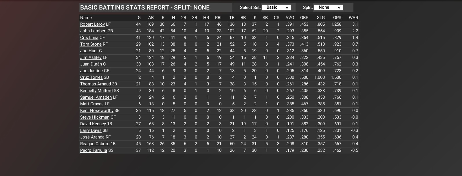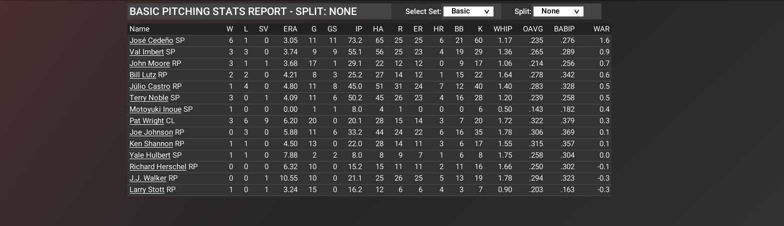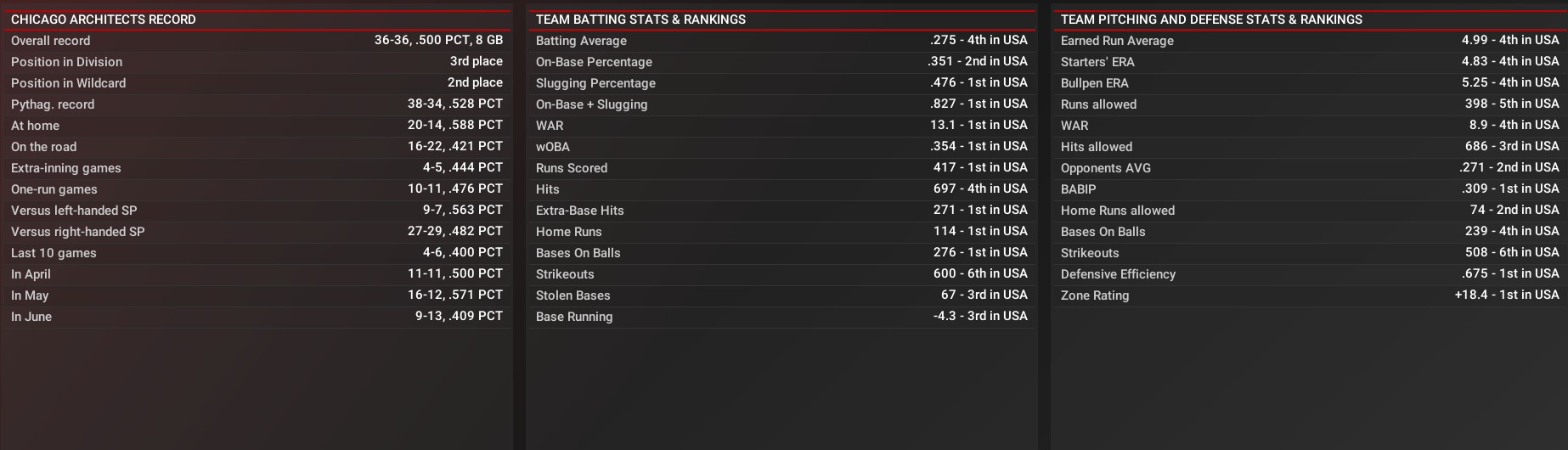 Duluth and Toledo up next then Milwaukee As we close in on the All-Star break and the mid-way point of the season, the Architects have a big series at 1st place Duluth and then 6 home games against 2nd-place Toledo and then last place Milwaukee visits. But first is an off-day on Monday June 12th. June 12th - Off-day June 13th-15th 2056 Chicago 31-29 3rd place USA @ Duluth Sea Gulls 36-24 1st Place in USA Still before the halfway point but this feels like a big series on the road against Duluth as we then follow that up with 3 games at home against Toledo. The two clubs that are ahead of us in the standings, this could be a real Make……or Break week Today we begin a 3-game series with the Duluth Sea Gulls on the road. We will meet in Sea Gulls Field, which seats 40000 and plays like a ballpark slightly favoring hitters. Going 36-24 so far this year, the Sea Gulls have compiled a .600 winning percentage. They are leading the South of the Border. Their number of runs scored of 291 rank 5th in the USA, their .267 batting average ranks 6th. On the other side of the diamond, they have given up 264 runs (1st) with their starters compiling an ERA of 3.95 which ranks 1st. Their bullpen sports an ERA of 3.65, ranking 1st. When playing against our Architects this season, they have a record of 4 wins and 5 losses. Here are the projected pitching matchups, our pitchers listed first: RHP Val Imbert (3-4, 4.41 ERA) vs RHP Will McNeely (5-3, 3.93 ERA) RHP Motoyuki Inoue (7-5, 3.51 ERA) vs RHP Chris Collier (4-4, 3.84 ERA) RHP Jose Cedeno (7-2 3.54 ERA) vs LHP Tim Gross (4-2, 4.09 ERA) The top 5 players on their team are: 1. 1B Jorge Rangel (Age: 25, Overall : 3.5, Potential: 4.0) 2. 2B Carlos Figueroa (30, 3.5, 3.5) 3. CF Carlos Sánchez (25, 3.0, 3.5) 4. RP Pedro Saldaña (25, 3.0, 3.0) 5. SP Chris Collier (24, 3.0, 3.0) Game #1 - Tuesday June 13th 2056 Chicago 31-29 @ Duluth 36-24 RHP Val Imbert (3-4, 4.41 ERA) vs RHP Will McNeely (5-3, 3.93 ERA) A - 39,710 Chicago’s José Aranda sets the tone with a three-run home run in the first. Teammate Rodeo Leroy goes 4-for-4 with a home run, a walk, two runs scored, and two RBIs. Chicago 13, Duluth 8. LF R LeRoy 4-4 HR 2R 2RBI BB, 1B D Kenney 3-5 HR 2R 3RBI, CF J Justice 2-5 DB HR 2R 3RBI HR - CH DH J Aranda (6), 1B D Kenney (3), LF R LeRoy (20), CF J Justice (6) Dul - none POTG - Chicago LF Robert LeRoy (8) Game #2 - Wednesday June 14th 2056 Chicago 32-29 @ Duluth 36-25 RHP Motoyuki Inoue (7-5, 3.51 ERA) vs RHP Chris Collier (4-4, 3.84 ERA) A - 39,847 Duluth’s middle infield was a problem at the beginning of the season, but promoting Jeff Beasley, 24, seems to have solved the problem at shortstop. Today, Beasley goes 3-for-4 with two home runs (one of which was a grand slam), three runs scored, and five RBIs. In 84 at-bats this season, he’s hitting .321/.380/.607. Teammate Rick Barnard also goes yard twice, and Carlos Sánchez hits a three-run home run. Duluth 12, Chicago 5. SS Mulford 3-4 HR R 2 RBI HR - CH SS K Mulford (3), 1B R Osborn (12), Dul - SS J Beasley 2 (6), DH R Barnard 2 (2), CF C Sanchez (5) POTG - Duluth SS Jeff Beasley Game #3 - Thursday June 15th 2056 Chicago 32-30 @ Duluth 37-25 RHP Jose Cedeno (7-2 3.54 ERA) vs LHP Tim Gross (4-2, 4.09 ERA) A - 39,741 Duluth’s Tim Gross (7 IP, 6 H, 3 R, 1 BB, 7 K) earns his fifth win. Tim Goyette, 22, hits his first major-league home run. Congrats, Tim! Carlos Figueroa singles in a run and hits a sac fly. Duluth 4, Chicago 3. 1B R Osborn 2-4 DB 2R, LF R LeRoy 2-4 2DB RBI HR - CH CF C Luna (6) Dul - C T Goyette (1) POTG - Duluth SP Tim Gross Summary - The Architects seem to often have trouble with Duluth SP Tim Gross and once again he does enough to pick up a huge win for the Sea Gulls. RP Larry Stott (1-1) lost his one, giving up a walk and a hit in the 8th. Last season we won this type of game, this year we lose them all too often. Even with the loss we have played the Sea Gulls even up during the first half with both sides winning 6 each. Now we have to change the directory of our season matchup with Toledo where the Neptunes have won 7 out of 9 games. Toledo Neptunes 36-27 2nd place in US vs Chicago Architects 32-31 T-3rd US June 16th through 19th 2056 Chicago’s Pier IV Grounds After dropping 2 out of 3 in Duluth, this series is our chance to get back into things with Toledo. We are 4 games behind Toledo right now and getting this season series back on track (like last season at this point) would be a huge step in the right direction. Today we begin a 3-game series with the Toledo Neptunes at home. The Neptunes are playing .571 ball this season, compiling a record of 36 wins and 27 losses. They are in 2nd place in the South of the Border, 2.0 games behind the leader. Their number of runs scored of 358 rank tied for 1st in the USA, their .280 batting average ranks 2nd. On the other side of the diamond, they have given up 286 runs (2nd) with their starters compiling an ERA of 4.20 which ranks 2nd. Their bullpen sports an ERA of 4.20, ranking 2nd. When playing against our Architects this season, they have a record of 7 wins and 2 losses. Here are the projected pitching matchups, our pitchers listed first: RHP Yale Hulbert (3-1, 8.31 ERA) vs RHP Nick Keddy (6-2, 2.83 ERA) RHP Terry Noble (4-2 5.88 ERA) vs RHP Christopher Bouchard (7-2, 3.06 ERA) RHP Motoyuki. Inoue (7-6, 3.70 ERA) vs RHP Warren Townsend (7-3, 4.06 ERA) The top 5 players on their team are: 1. SP Nick Keddy (Age: 29, Overall : 4.5, Potential: 4.5) 2. RP Ricardo Valentín (30, 4.0, 4.0) 3. SP Christopher Bouchard (29, 3.5, 3.5) 4. 1B Eric Molina (30, 3.5, 3.5) 5. 2B Xing-fu Sen (25, 3.5, 4.0) Game #1 -Friday June 15th 2056 Toledo 36-27 vs Chicago 32-31 RHP Nick Keddy (6-2, 2.83 ERA) vs RHP Yale Hulbert (3-1, 8.31 ERA) A - 36,381 Too much SP Nick Keddy (6.2IP 4H 1R 2BB 6K) and not enough (good) SP Yale Hulburt. Toledo takes a 2-1 lead into the sixth, where Hulburt loads the bases and makes a huge mistake as Luîs González hits a gr