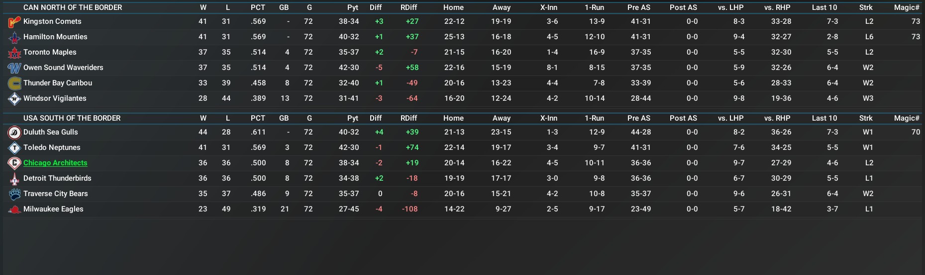 RP J Johnson 3.2IP 1H 0R 1BB 3K, RP J Castro 3IP 1H 0R 3K, RP K Shannon 1IP 0H 0R, C J Hunt 2-3 HR - Win 3B C Allen (6), CH - none POTG - Matsusuke Yoshida Game #2 - Tuesday June 6th 2056 Windsor 22-32 vs Chicago 29-25 RHP Dan Floyd (0-5, 5.16 ERA) vs RHP Jose Cedeño (6-1, 3.42 ERA) A - 37,167 Chicago’s Rodeo Leroy has a huge day. He goes 5-for-5 with two home runs, two doubles, four runs scored, and five RBIs. José Cedeño (7.1 IP, 7 H, 2 R, 1 BB, 7 K) doesn’t do so bad himself. Chicago 10, Windsor 2. LF R LeRoy 5-5 2DB 2HR 4R 5 RBI, 2B J Lambert 2-4 R RBI BB, RF T Stone 3-4 DB 2R 2RBI BB, SB, SS K Mulford 2-5 DB R HR - Win 1B C Hargrove (13), CH - LF R LeRoy 2 (19), POTG - Chicago LF Robert “Rodeo” LeRoy (7) Summary - Will save our comments for after the Owen Sound 2-game series and wrap up Canada for the first half of the season. Chicago Architects 30-25 3rd in US @ Owen Sound Waveriders 25-30 4th in Canada June 7th and 8th 2056 Owen Sounds Waveriders Ballpark Today we begin a 2-game series with the Owen Sound Waveriders on the road. The Waveriders play their games in Waveriders Ballpark, which can be described as a slight pitchers park. The building seats 40000 fans. With their record standing at 25 wins and 30 losses, the Waveriders have a winning percentage of .455. They are in 4th place in the North of the Border, 10.0 games behind the leader. Their number of runs scored of 252 rank 6th in the Canadian, their .275 batting average ranks 5th. On the other side of the diamond, they have given up 238 runs (2nd) with their starters compiling an ERA of 4.58 which ranks 3rd. Their bullpen sports an ERA of 3.20, ranking 1st. Here are the projected pitching matchups, our pitchers listed first: RHP M. Inoue (3-0 1.89) vs RHP J. Honoré (4-5, 4.92 ERA) RHP V Imbert (4-2 5.88) vs RHP P. Arthur (3-4, 4.91 ERA) The top 5 players on their team are: 1. SP Maynard Nicholson (Age: 25, Overall : 4.0, Potential: 4.0) 2. 1B Pablo Parrel (28, 4.0, 4.0) 3. LF Josselin Leroy (37, 3.5, 3.5) 4. C Prímio Lebrim (27, 3.0, 3.0) 5. SP Ilies Kieffer (26, 3.0, 3.0) Game #1 - Wednesday June 7th 2056 Chicago 30-25 @ Owen Sound 25-30 RHP Motoyuki Inoue (3-0 1.89) vs RHP Jonathan Honoré (4-5, 4.92 ERA) A - 28,832 Owen Sound’s Jonathan Honoré (6 IP, 4 H, 2 R, 1 BB, 8 K) out-pitches Chicago’s Motoyuki Inoue (3.2 IP, 7 H, 5 R, 4 ER, 2 BB, 3 K). Inoue picks up his first loss as an architect. Owen Sound’s Cruz Torres goes 4-for-4 with two doubles, one run, and one RBI. Rodney Collins singles three times, steals two bases, scores once, and drives in one. Owen Sound 6, Chicago 2. 5 hits and that is it HR - CH 1B R Osborn (10) OS - none POTG - Owen Sound SP Jonathan Honore Game #2 - Thursday June 8th 2056 Chicago 30-26 @ Owen Sound 26-30 RHP Val Imbert (3-4 4.61) vs RHP P. Arthur (3-4, 4.91 ERA) A - 25,983 In the eighth, Andrés Rodríguez singles in two, turning a 3-2 deficit into a 4-3 Waveriders lead. In the ninth, Chicago’s David Kenney doubles, moves to third on a ground out, and scores on a sac fly to left. Tie game, 4-4. In the 10th, Yves Moreno doubles, moves to third on a wild pitch, then gets thrown at home on a squeeze bunt attempt. By the way, the bunter reaches first but gets picked off to end the inning. In the 14th, Reagan Osborn, who finishes the game with four bases-on-balls, singles, and Rodeo Leroy doubles him in. But not so fast! In the bottom of the 14th, Pablo Parrel walks, and Prímio Lebrim doubles him in. Tied game, 5-5. In the 15th, Spencer D’Urberville reaches second base on a throwing error by the shortstop. He moved to third on a sac fly to left (?), then scored the winning run on a Maynard Nicholson single. Owen Sound 6, Chicago 5. 15 Innings 1B R Osborn 1-2 2R 4BB, LF R LeRoy 2-6 2DB 2RBI BB, C J Hunt 2-5 DB R SP V Imbert 6.2IP 5H 2R 2BB 1K, CL P Wright 3IP 4H 0R BB, K, RP J Moore 3IP 2H 1R 2BB K HR - CH SS K Mulford (2), OS - none POTG - Owen Sound SP Paul Arthur Summary - To summarize this set of 4 games in a few words….I hate Canada!!!! With this set of games going 1-3 and now 4-8 on the season it will take a huge effort to get out of the hole we are digging ourselves in these games. Duluth is 9-3 against the Canadian clubs and Toledo improved to 5-7 after this set of games. One reason why Detroit is hanging around, they are 8-4 in the Canadian games. Clearly the Architects are not doing their part in trying to help the USA clubs win the inter-divisional series for the first time in my 5 seasons running Chicago. With this Canadian failure we are now 4 games out of 1st place and 3 games behind Toledo for the Wildcard and Detroit while sub 500 at 28-30 is nipping at our heels just 2 games back of us. Maybe the bright side of things is we are heading back to the US and to Detroit where we have gone 8-1 against the Thunderbirds so far this season and negating their Canadian record advantage. A big series for both clubs, for Detroit they could move into 3rd place with a sweep. For the Architects we could pick up some lost momentum after the 4 games with Canadian Clubs. And not winning that last game that went 15 innings and taxing our bullpen only figures to cause us pain elsewhere. Chicago Architects 30-27 3rd in the US @ Detroit Thunderbirds 28-30 4th in the US June 9th through 11th 2056 At Detroit’s Thunderbird Park We took a look at the Detroit Thunderbirds, our next opponent in an upcoming 3-game series, and here are the results. A neutral park, Thunderbirds Ballpark has room for 40000 fans. The Thunderbirds are playing .491 ball this season, compiling a record of 28 wins and 29 losses. They are in 4th place in the South of the Border, 6.0 games behind the leader. Their number of runs scored of 303 rank 3rd in the USA, their .285 batting average ranks 1st. On the other side of the diamond, they have given up 308 runs (4th) with their starters compiling an ERA of 5.45 which ranks 6th. Their bullpen sports an ERA of 5.35, ranking 4th. When playing against our Archit