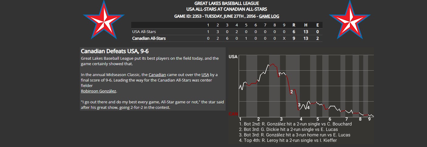 2056 GLBL All-Star Game Festivities Final All-Star Voting Included below are the final voting results for the USA All-Stars. The top vote getter at each position, as well as the top 3 starters and relievers, will be included on the final roster for each team. The top player, Robert Leroy, received 4,559,918 votes. CATCHER 1. Cecil Phillips, Milwaukee Eagles: 2,356,393 2. Ken Armour, Toledo Neptunes: 1,254,385 3. Juan Durán, Chicago Architects: 1,212,917 FIRST BASE 1. Mal Johnston, Detroit Thunderbirds: 2,923,306 2. Jorge Rangel, Duluth Sea Gulls: 2,378,707 3. Reagan Osborn, Chicago Architects: 2,329,043 SECOND BASE 1. Paul Larocque, Detroit Thunderbirds: 2,444,342 2. John Lambert, Chicago Architects: 2,160,931 3. Cory Seguin, Milwaukee Eagles: 1,458,152 THIRD BASE 1. Luis González, Toledo Neptunes: 2,033,053 2. Alexis Martin, Traverse City Bears: 1,679,256 3. Thomas Arnaud, Chicago Architects: 1,650,920 SHORTSTOP 1. Larry Thomson, Detroit Thunderbirds: 1,642,067 2. Carlos Montaño, Toledo Neptunes: 1,451,035 3. Alexandre Gasnier, Milwaukee Eagles: 773,526 LEFT FIELD 1. Robert Leroy, Chicago Architects: 4,559,918 2. Gray Dijkstra, Toledo Neptunes: 1,858,588 3. Melvin Akerval, Detroit Thunderbirds: 1,621,304 CENTER FIELD 1. Cal Braud, Traverse City Bears: 2,266,521 2. Cris Luna, Chicago Architects: 1,775,479 3. George Goff, Duluth Sea Gulls: 1,617,661 RIGHT FIELD 1. Earl Foote, Traverse City Bears: 3,786,371 2. Stan Gillis, Detroit Thunderbirds: 2,757,669 3. Mark Wadell, Toledo Neptunes: 2,165,178 DESIGNATED HITTER 1. Eric Molina, Toledo Neptunes: 3,242,943 2. Carlos Sánchez, Duluth Sea Gulls: 3,202,551 3. Ben Marshall, Traverse City Bears: 2,155,975 STARTING PITCHER 1. Nick Keddy, Toledo Neptunes: 1,606,829 2. Christopher Bouchard, Toledo Neptunes: 1,128,988 3. José Cedeño, Chicago Architects: 1,128,524 4. Val Imbert, Chicago Architects: 1,018,970 5. Bill Clary, Detroit Thunderbirds: 912,063 RELIEVER 1. Pat Wright, Chicago Architects: 1,198,736 2. José Árias, Duluth Sea Gulls: 993,880 3. Santiago Costa, Toledo Neptunes: 961,775 4. Quincy Cooper, Toledo Neptunes: 872,854 5. Pedro Saldaña, Duluth Sea Gulls: 579,607 His career numbers show Leroy is currently carrying a .301 lifetime batting average with 224 home runs and 752 RBIs. Included below are the final voting results for the Canadian All-Stars. The top vote getter at each position, as well as the top 3 starters and relievers, will be included on the final roster for each team. The top player, Jamal Amador, received 3,653,791 votes. CATCHER 1. Prímio Lebrim, Owen Sound Waveriders: 1,930,436 2. Thomas Gilles, Thunder Bay Caribou: 1,722,789 3. Thibaud Lacroix, Hamilton Mounties: 1,121,879 FIRST BASE 1. Craig Hargrove, Windsor Vigilantes: 3,476,883 2. Pablo Parrel, Owen Sound Waveriders: 2,337,632 3. Dusty Murphy, Toronto Maples: 2,187,847 SECOND BASE 1. Carlos Figueroa, Duluth Sea Gulls: 3,012,912 2. Li-ping Chin, Hamilton Mounties: 2,705,243 3. Johnny Peterson, Kingston Comets: 2,140,823 THIRD BASE 1. Yves Moreno, Owen Sound Waveriders: 2,241,645 2. Michael Jackson, Thunder Bay Caribou: 1,576,268 3. P.J. Harper, Hamilton Mounties: 1,555,044 SHORTSTOP 1. John Calder, Thunder Bay Caribou: 1,974,421 2. Wyatt McBryde, Kingston Comets: 1,914,304 3. Casey Cowley, Toronto Maples: 1,809,150 LEFT FIELD 1. Jamal Amador, Thunder Bay Caribou: 3,653,791 2. Dwayne Adams, Toronto Maples: 2,611,885 3. Kurt Patrick, Windsor Vigilantes: 1,915,064 CENTER FIELD 1. Peyton Coffman, Toronto Maples: 3,034,098 2. Robinson González, Thunder Bay Caribou: 3,023,239 3. Mike Webster, Kingston Comets: 2,104,847 RIGHT FIELD 1. Wilson Meléndez, Hamilton Mounties: 2,048,967 2. Carlos Alomar, Windsor Vigilantes: 1,737,203 3. Colin Henry, Toronto Maples: 1,519,160 DESIGNATED HITTER 1. Glen Dickie, Hamilton Mounties: 3,074,751 2. Josselin Leroy, Owen Sound Waveriders: 2,387,285 3. Mark Easson, Windsor Vigilantes: 1,752,440 STARTING PITCHER 1. Sean Moore, Hamilton Mounties: 2,564,092 2. Motoyuki Inoue, Chicago Architects: 2,410,270 3. Yakumo Hasegawa, Hamilton Mounties: 2,150,876 4. Roland Fuller, Kingston Comets: 1,520,486 5. Ilies Kieffer, Owen Sound Waveriders: 1,456,837 RELIEVER 1. Roberto Terraza, Thunder Bay Caribou: 3,154,010 2. Rich Quick, Owen Sound Waveriders: 2,410,219 3. Harvey Sokhakian, Kingston Comets: 1,657,964 4. Tony Wilbraham, Hamilton Mounties: 1,497,588 5. Talbot Bergeron, Toronto Maples: 1,449,131 Career-to-date Amador has rung up a .314 average, played in 1156 games and collected 292 doubles, 28 triples and 269 home runs. All Star Game Week This year the All-Star game is in Duluth and it seems appropriate that the club with the best 1st half record is hosting the game. The full All-Star Game rosters have been announced. It's All-Star Game time -- time for the superstars to shine! Every year Great Lakes Baseball League takes a break in the schedule to play the annual All-Star Game. It's a battle of the superstars -- the Canadian All-Stars versus the USA All-Stars. The All-Star Game will spotlight the best hitters, the best pitchers and the best fielders, all doing battle against one another, all trying to prove their league is best. The Canadian roster will feature these outstanding players: SP Talbot Bergeron (TOR) - 4-2, 2.18 ERA, 45.1 IP, 1.30 WHIP, 7.7 K/9, 0.9 WAR SP Yakumo Hasegawa (HAM) - 6-4, 3.66 ERA, 115.2 IP, 1.17 WHIP, 7.8 K/9, 2.7 WAR SP Cal Henry (KIN) - 1-0, 3.32 ERA, 62.1 IP, 1.38 WHIP, 7.4 K/9, 0.8 WAR SP Jonathan Honoré (OWS) - 7-5, 4.11 ERA, 81.0 IP, 1.27 WHIP, 9.2 K/9, 2.0 WAR SP Ilies Kieffer (OWS) - 4-5, 3.69 ERA, 83.0 IP, 1.28 WHIP, 6.5 K/9, 1.8 WAR SP Sean Moore (HAM)* - 6-2, 3.40 ERA, 82.0 IP, 1.30 WHIP, 6.6 K/9, 1.7 WAR SP Maynard Nicholson (OWS) - 6-3, 3.53 ERA, 63.2 IP, 1.08 WHIP, 9.9 K/9, 1.9 WAR RP Chris Andrews (OWS) - 1-0, 2.74 ERA, 46.0 IP, 1.28 WHIP, 7.2 K/9, 0.5 WAR RP Emmett Dodman (TB) - 2-0, 3.45 ERA, 44.1 IP, 1.33 WHIP, 6.1 K/9, 0.6 WAR RP Rich Quick (OWS) - 1-4, 2.29 ERA, 51.0 IP, 1.25 WHIP, 7.4 K/9, 