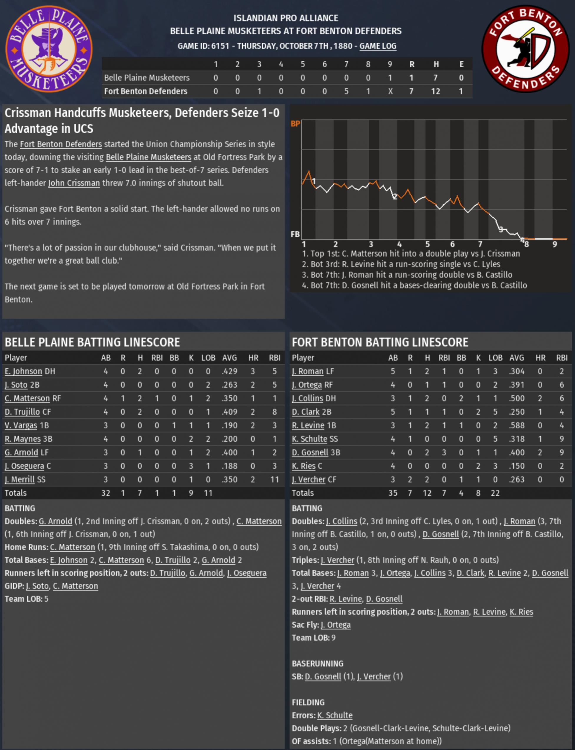 The Fort Benton defenders are going to the Pro Cup for the 3rd time in 5 seasons, and 4th time overall (1871 1876 1878 1880). They won the Pro Cup in 1871 and will be looking for their 2nd title. Belle Plaine is now 0 for 5 in the Union Championship Series. |