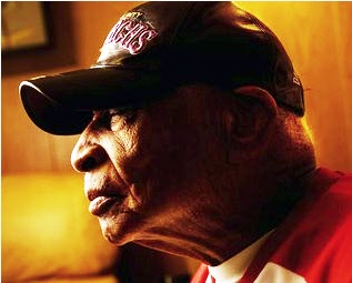 Elmer "Willie" Carter, C/SS/1B, is shown as an older man wearing a Kansas City Monarchs cap. This was an obituary photo.