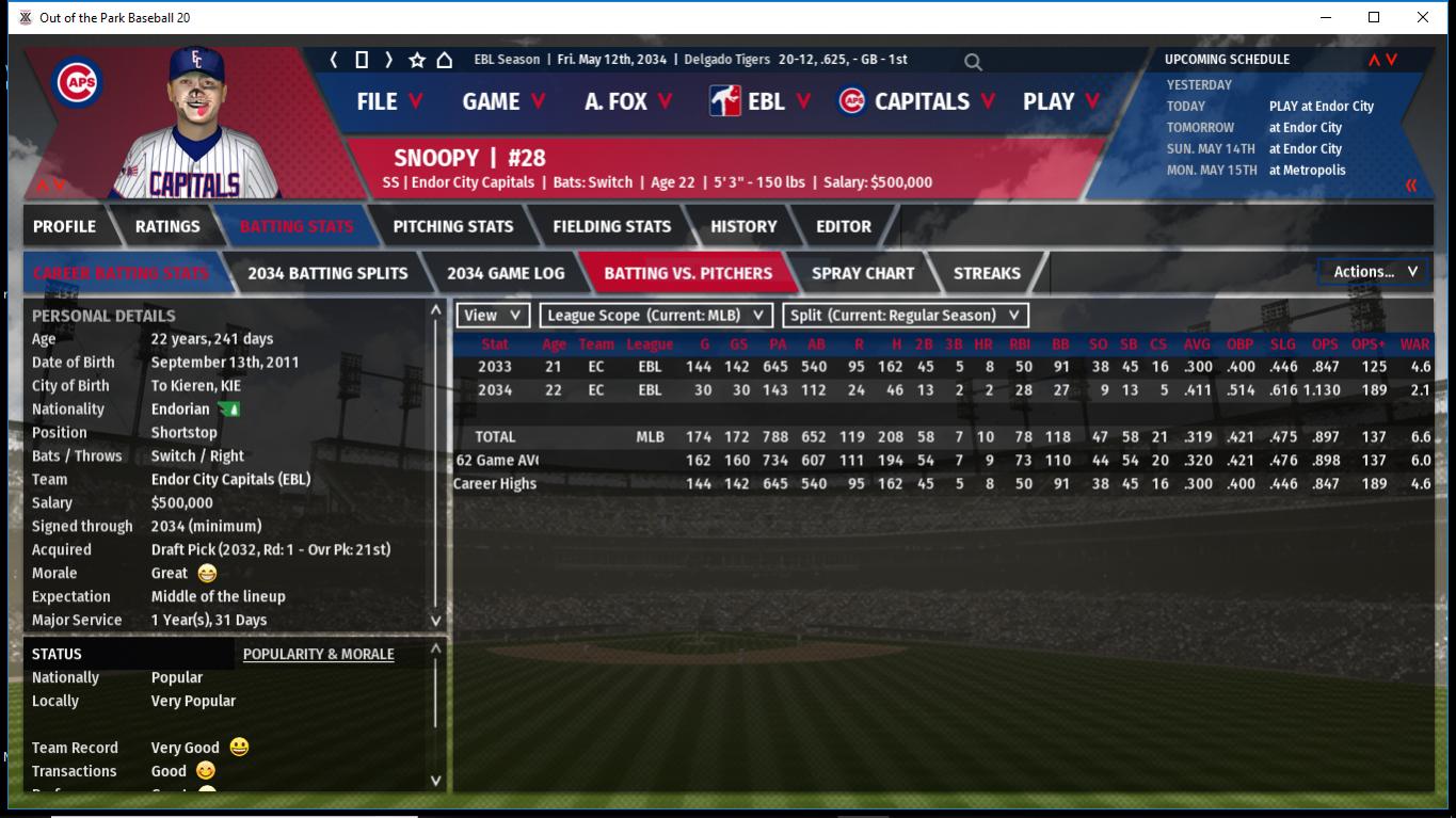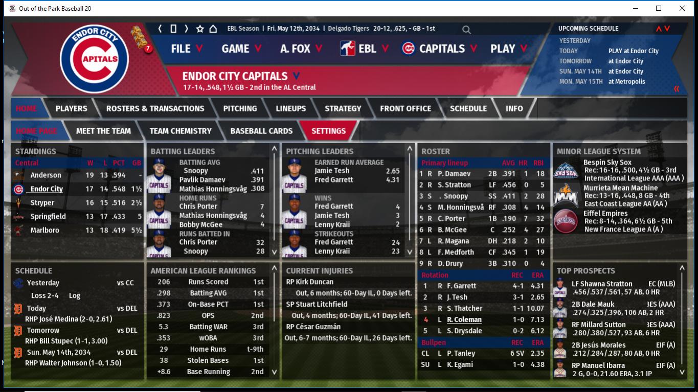The Caps are in a good position to overtake Anderson in the AL Central. Right now they have the best overall offense in the AL but one of the worst staffs. Really potent offense with rookie LF Shawna Stratton, 2ndf yr SS Snoopy then veterans like newly acquired Chris Porter, C Bobby McGee and Cf Frank Medforth. If my rotation can keep them in check, my offense should tee off on their rotation and bullpen. We are on a 5 game winning streak. Most of us love coming to Endor City with the history several of us had here.