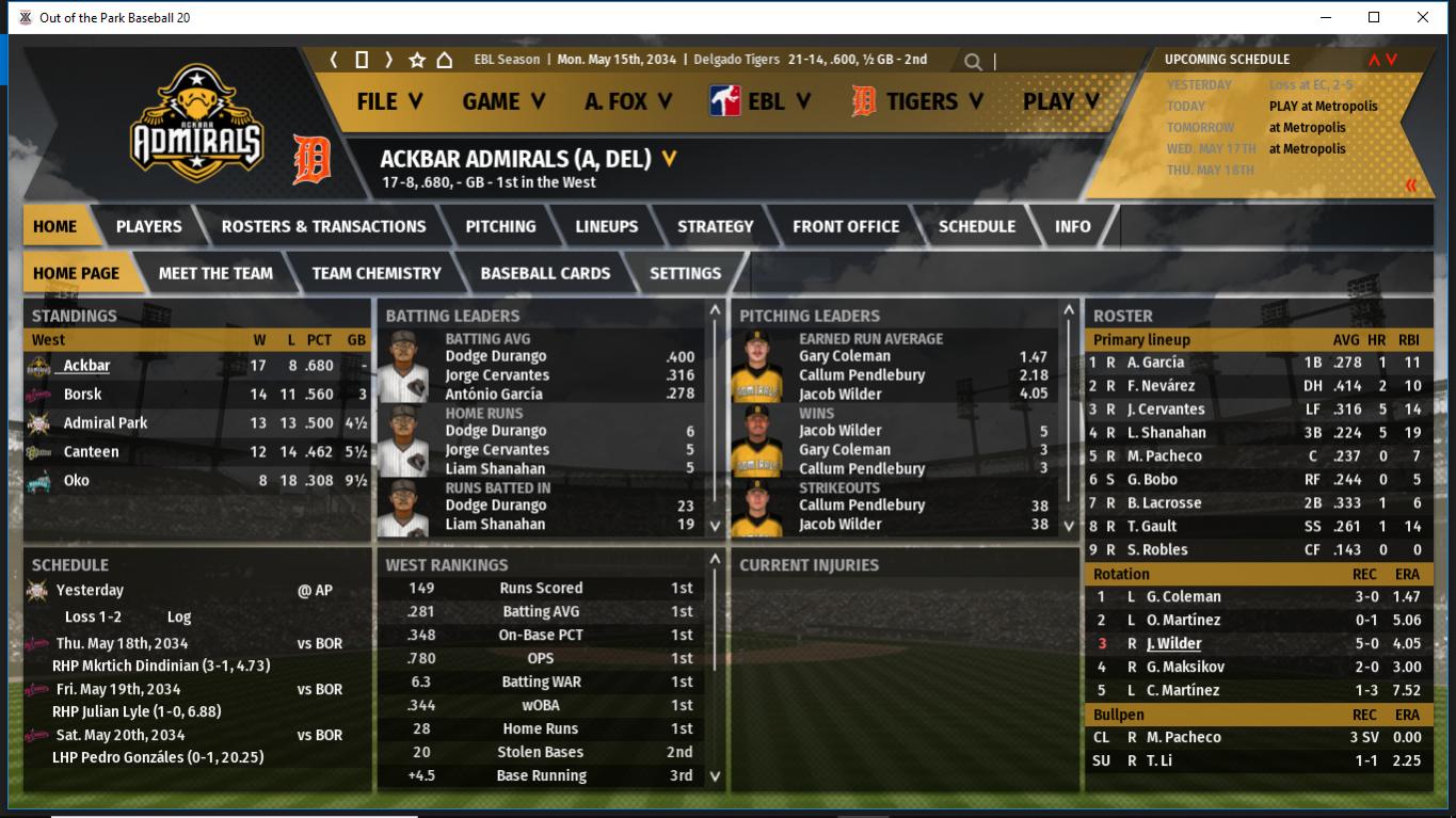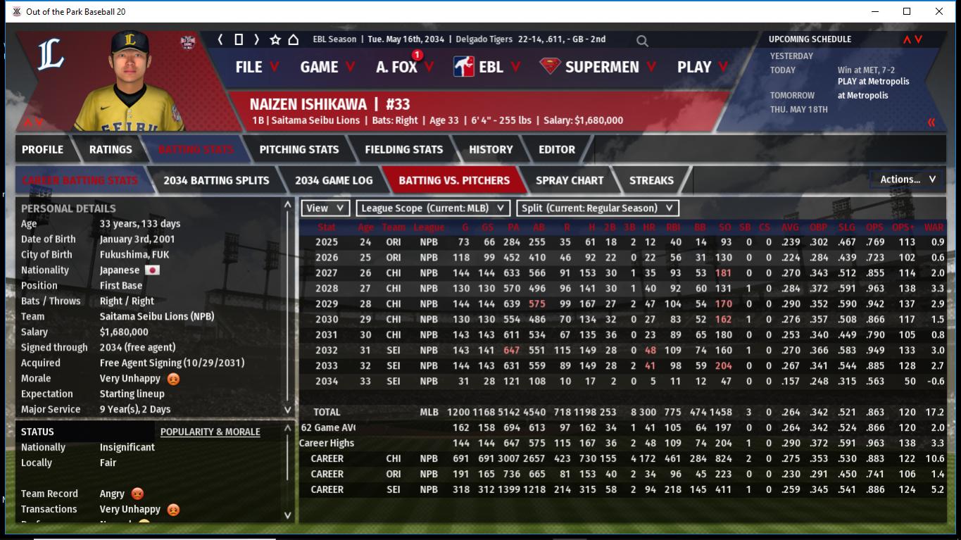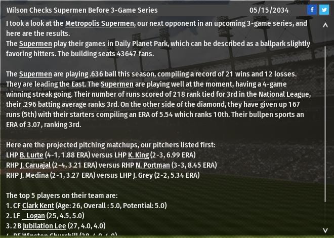 This should be our last season with having Metropolis as our NL rival. We should have Rocky Top next season, since we both play in the same state and the Supermen should have Gotham City. This team is the defending NL: pennant winners and are in a great position to make it to the BOE again. Rookie c Forte is a good average good defensive C. SP Jean Grey might be the Supermen best SP. Their offense is great, their rotation is struggling but should be great by seasons end. Their pen is above average.George Lattman is now their MGR, so I am managing vs one of my best friends and i gave him his start managing while with Endor City in 2015.