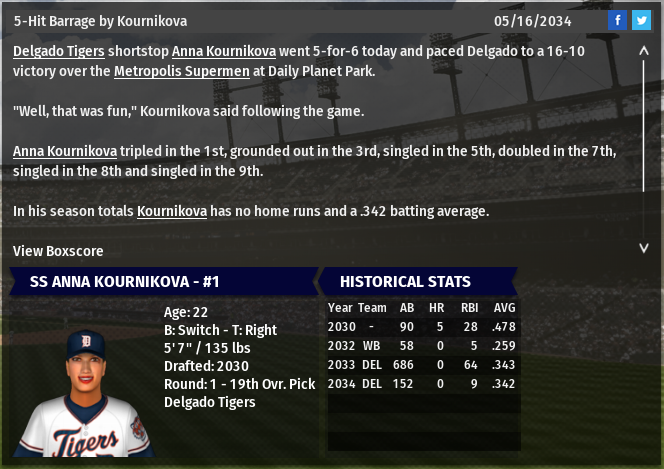 Delgado 2b Koot Kat has a 3 Hr 5 Hit game. SS Anna Kournikova has a 5 Hit game.